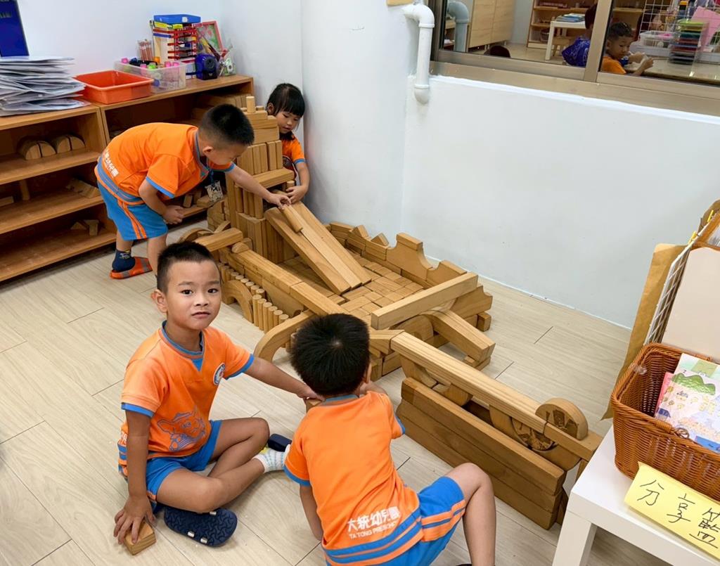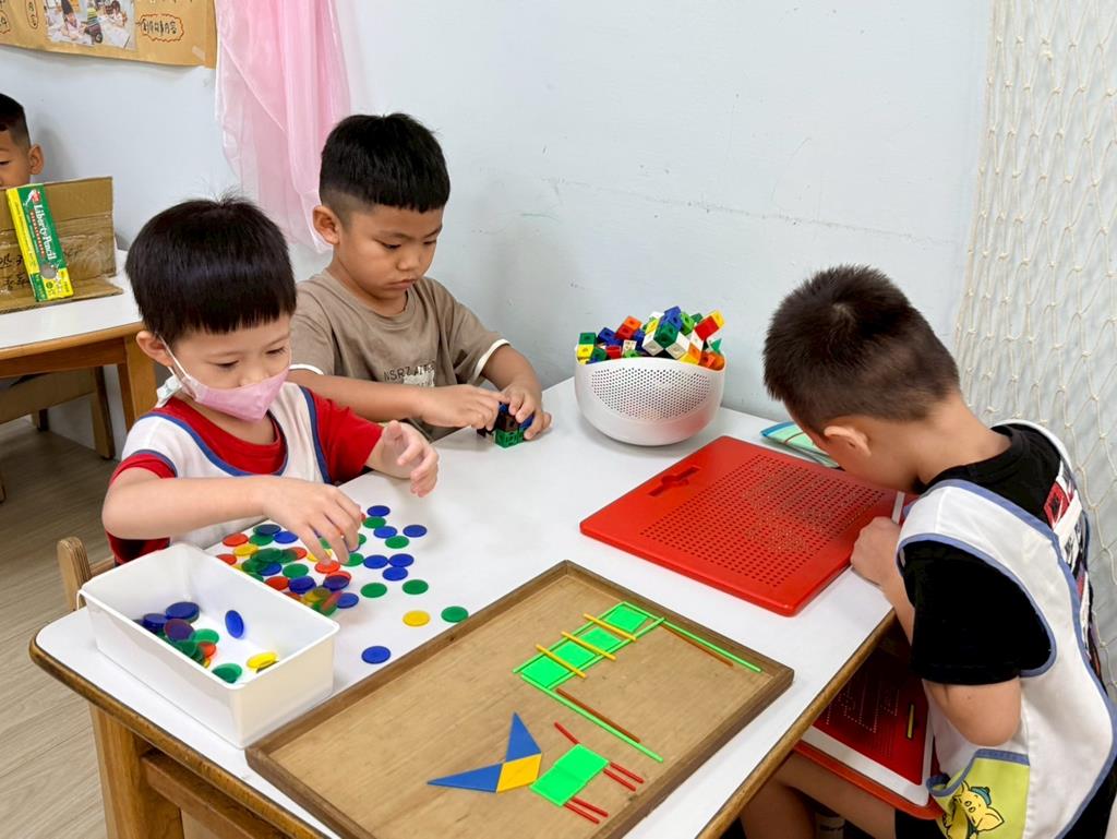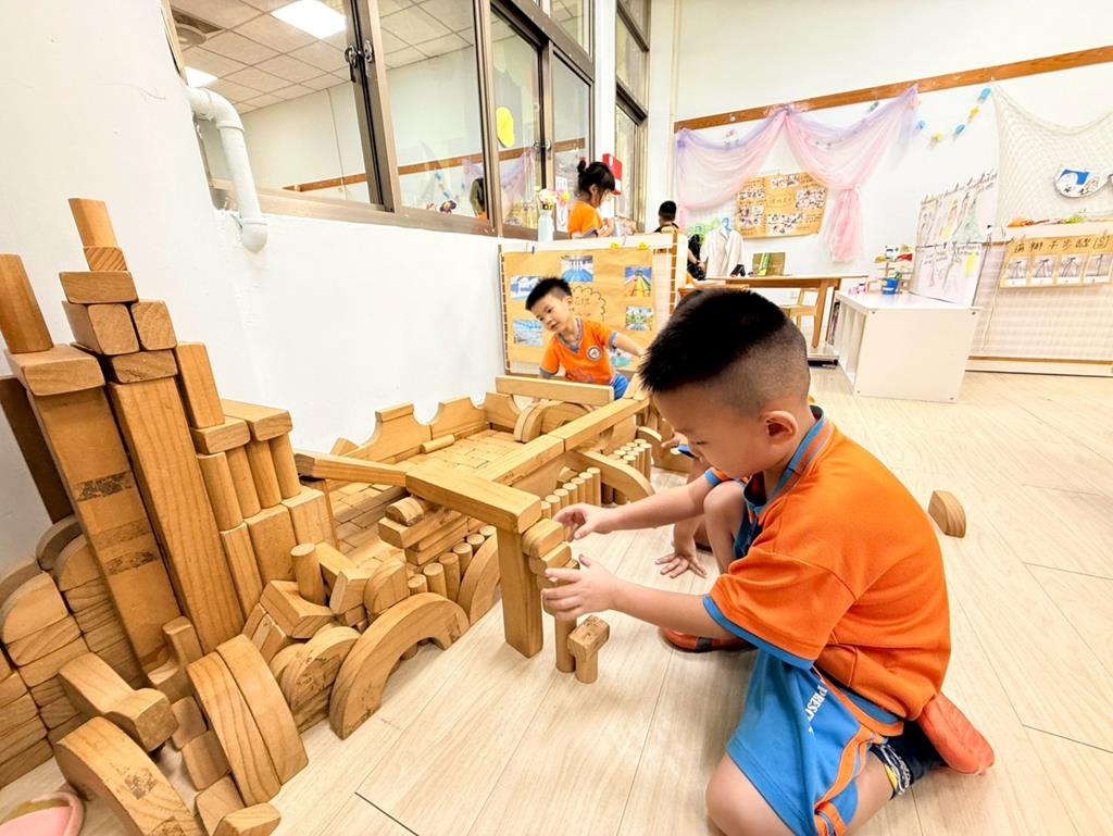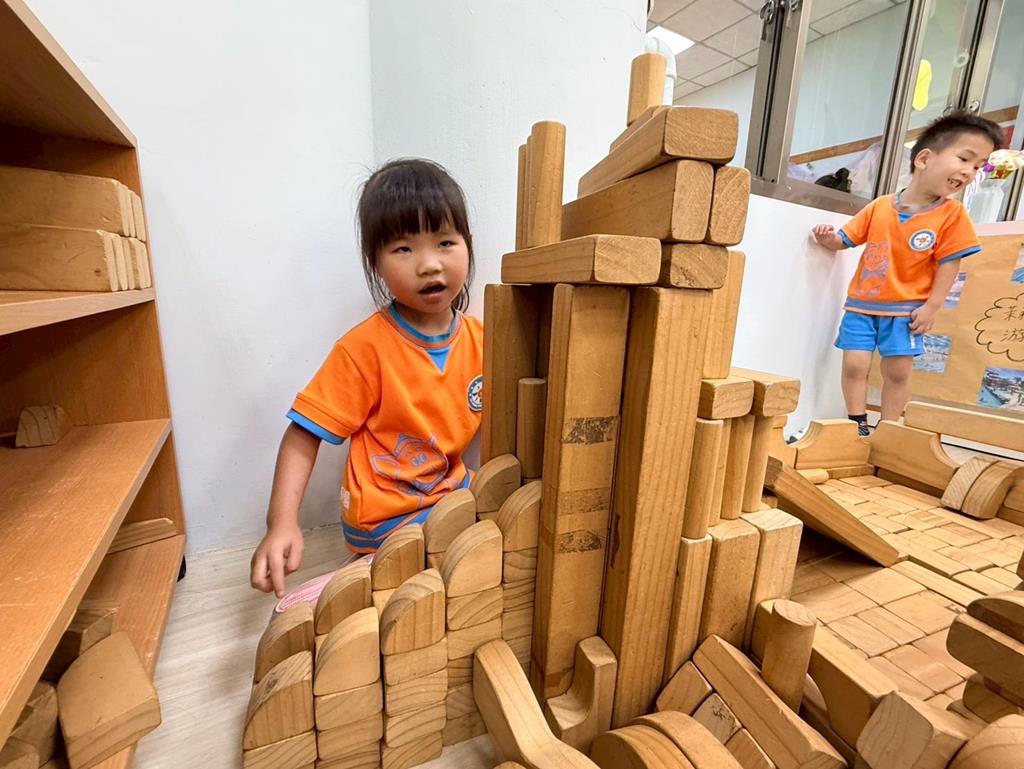 相簿名稱: 益智區-操作各式各樣教具;積木區-用積木搭蓋游泳池跳水板及增高圍牆並共同合作討論修正方法