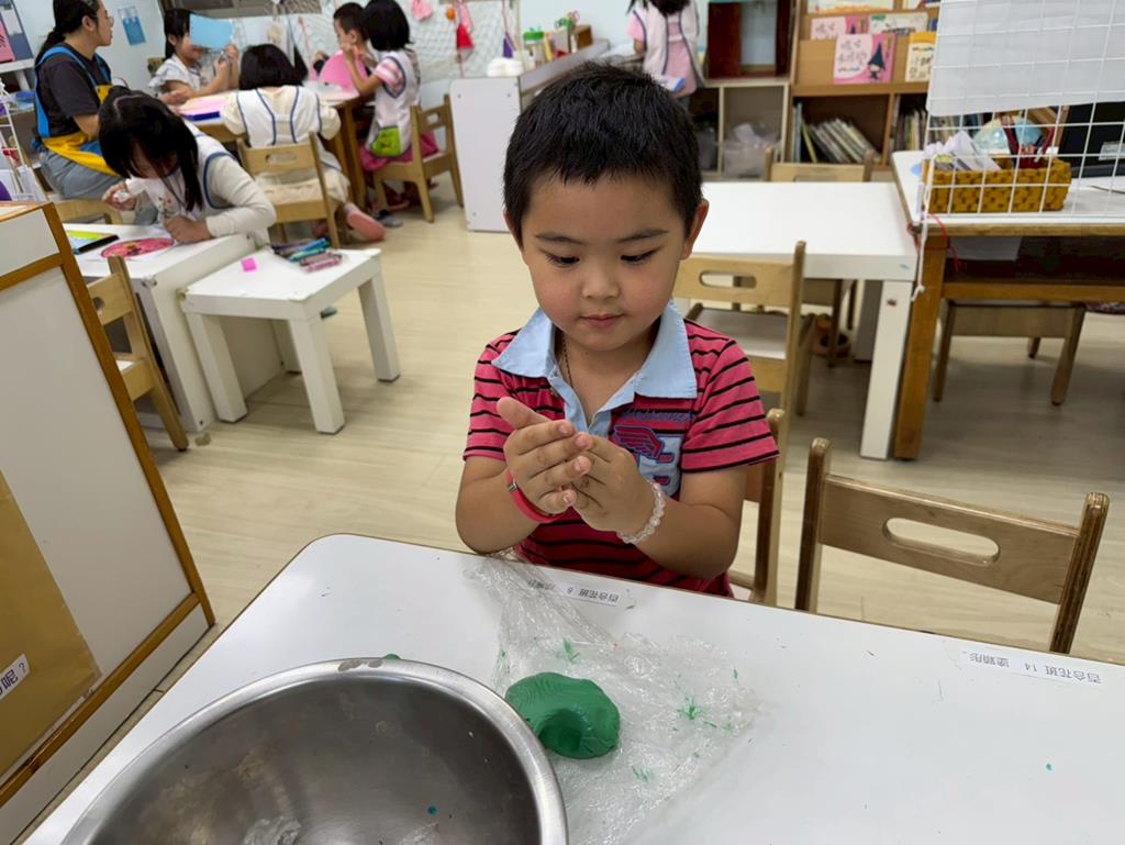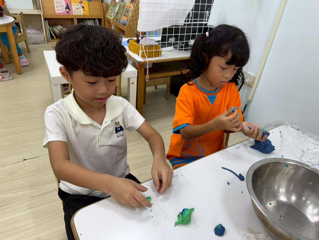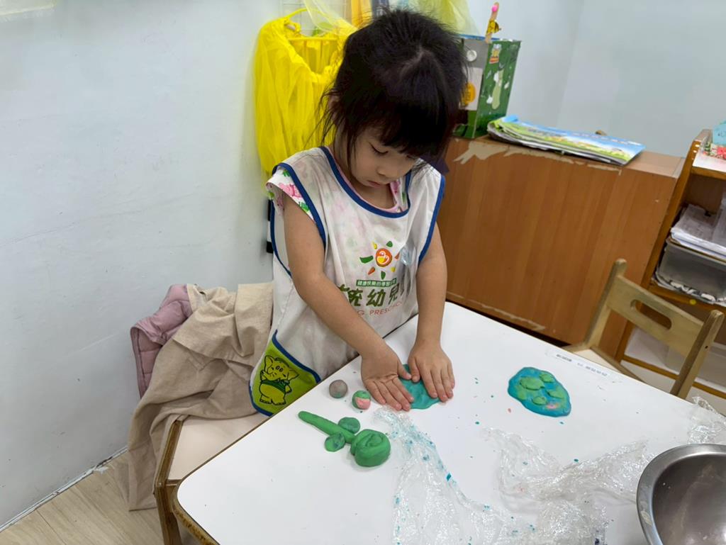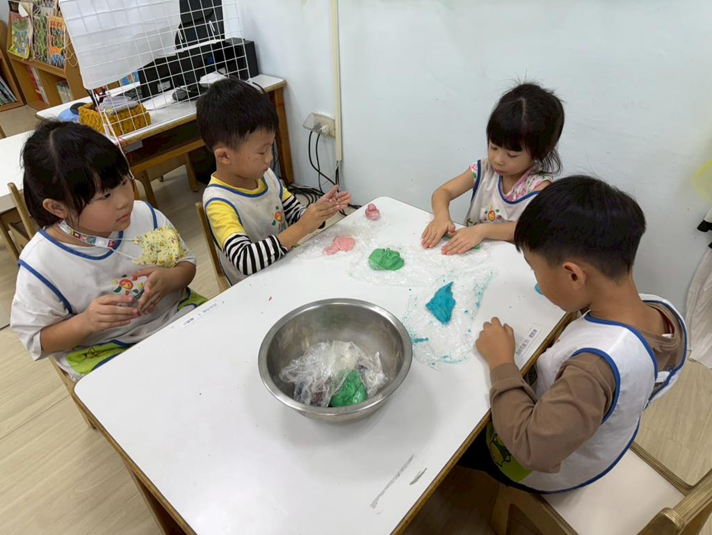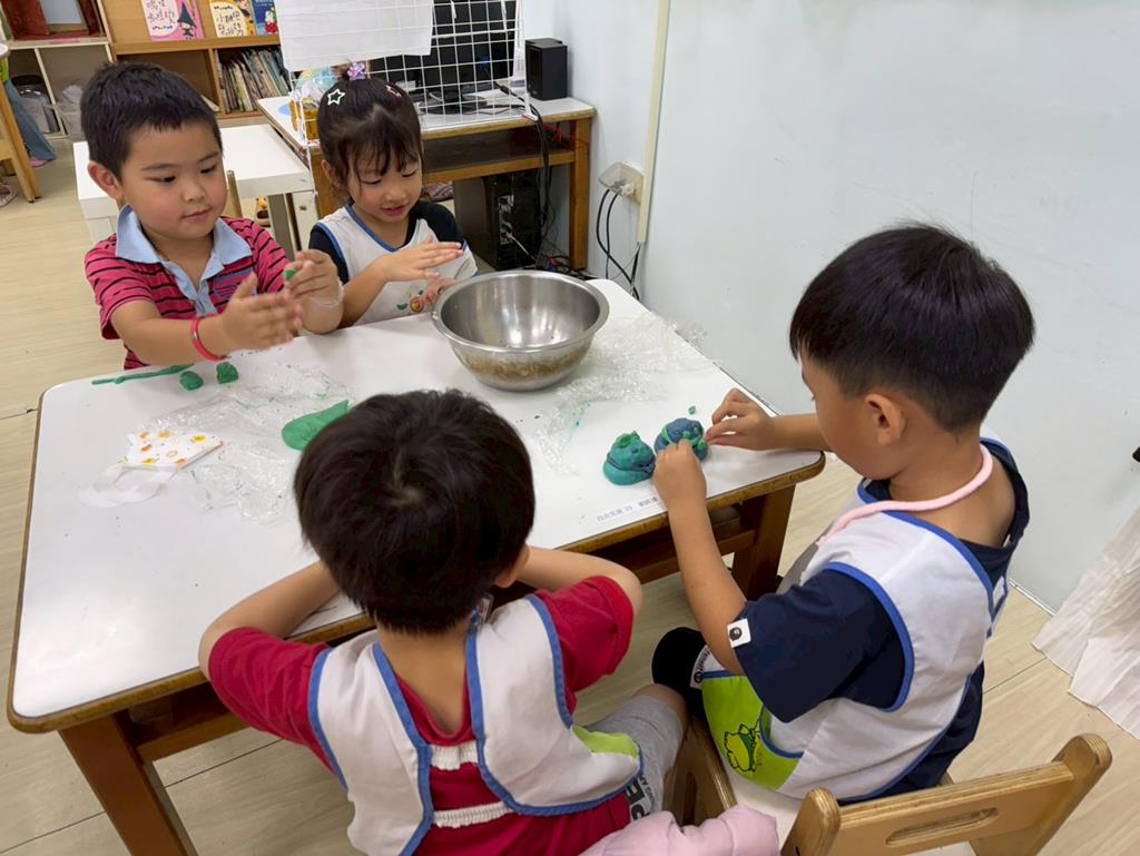 相簿名稱: 娃娃-圖書館活動(麵粉糰染出不同的綠)製作借書證及張貼海報