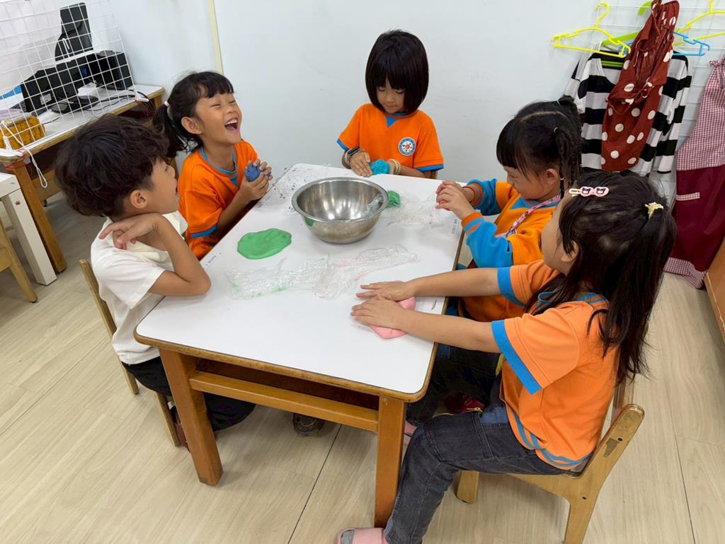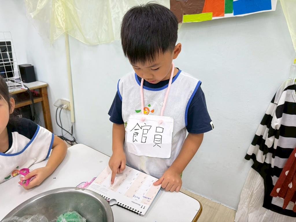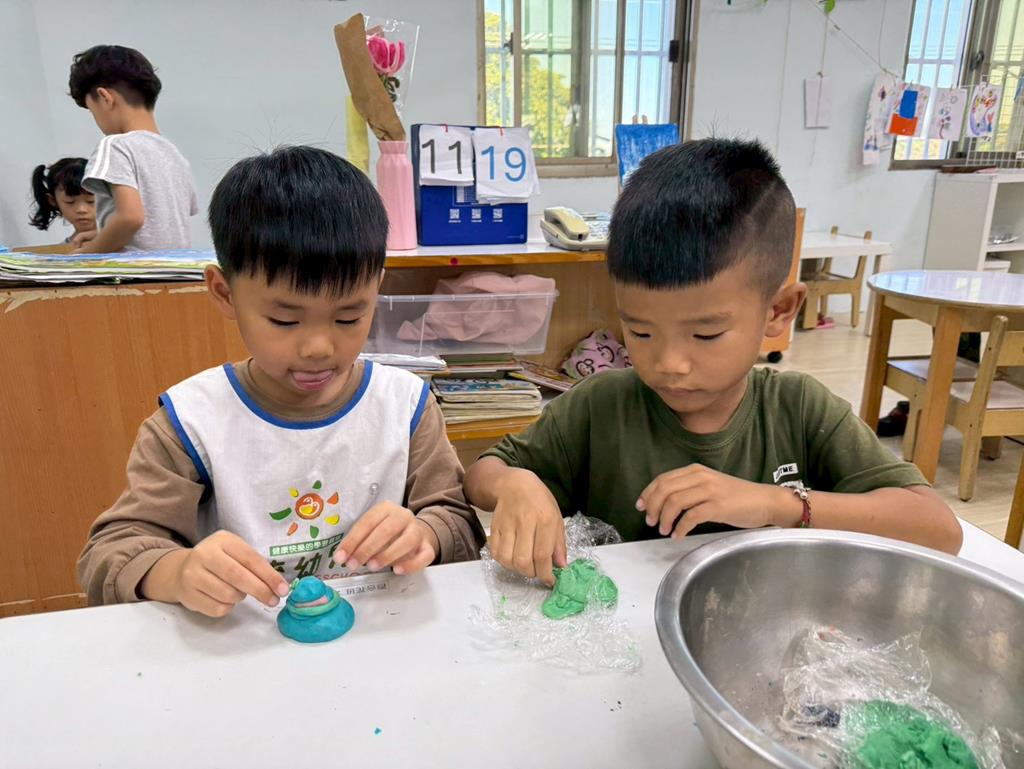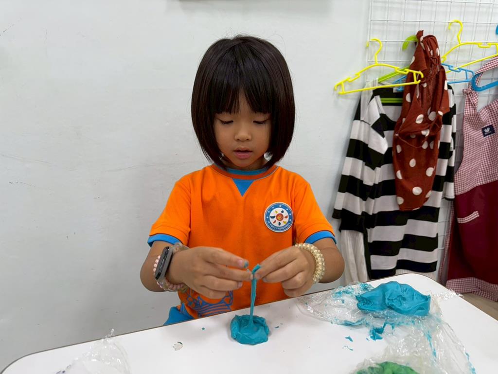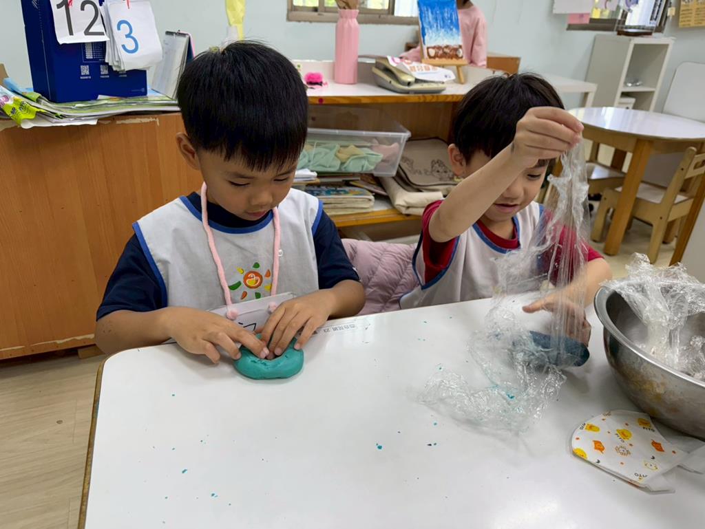 相簿名稱: 娃娃-圖書館活動(麵粉糰染出不同的綠)製作借書證及張貼海報