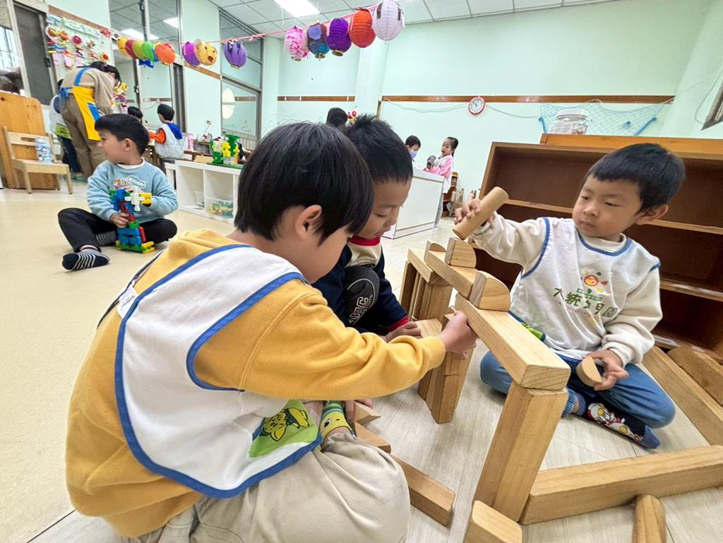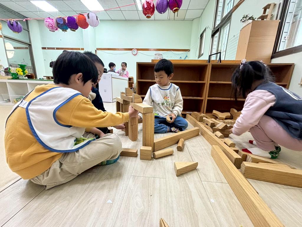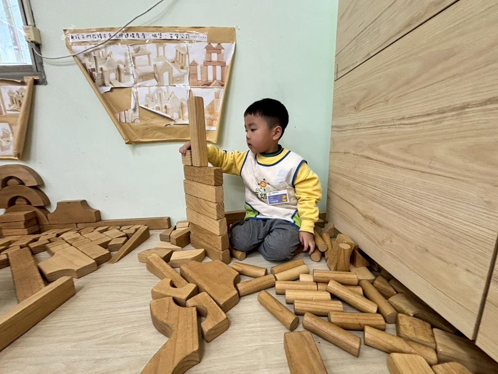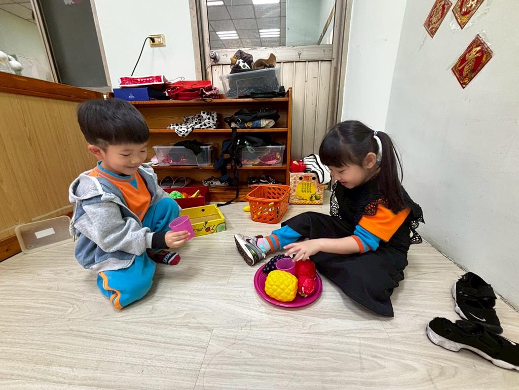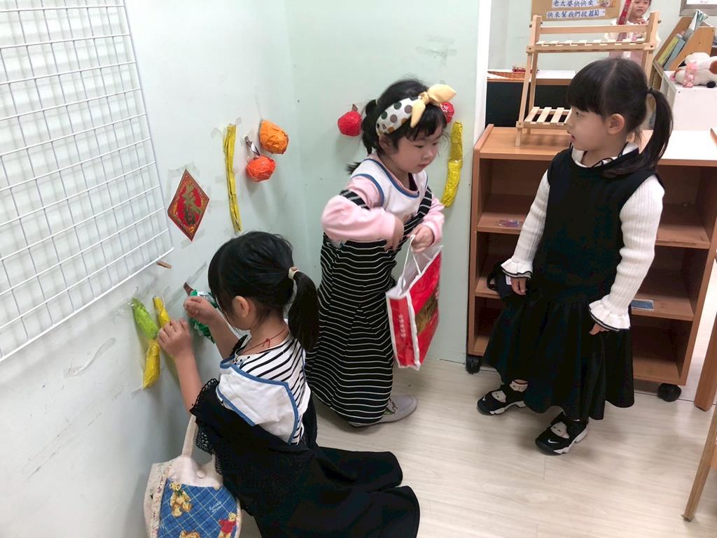 相簿名稱: 扮演區邀請客人來家裡吃水果過年、佈置貼春聯;積木區建構過年相關廟宇