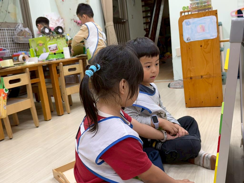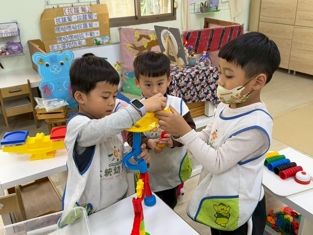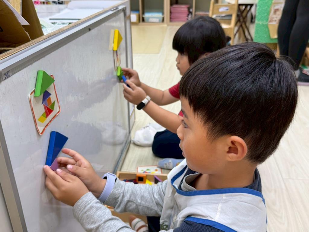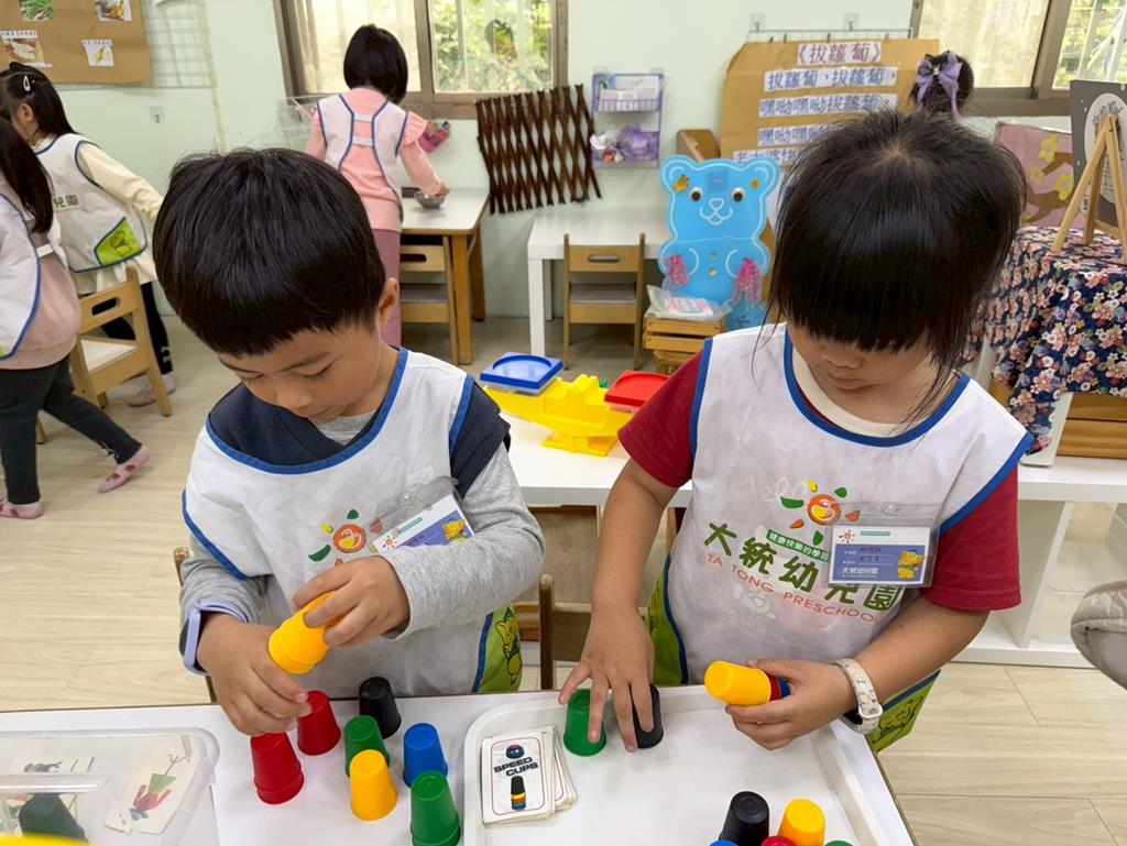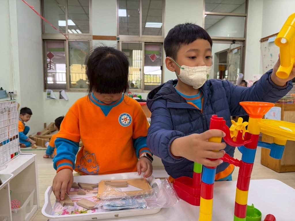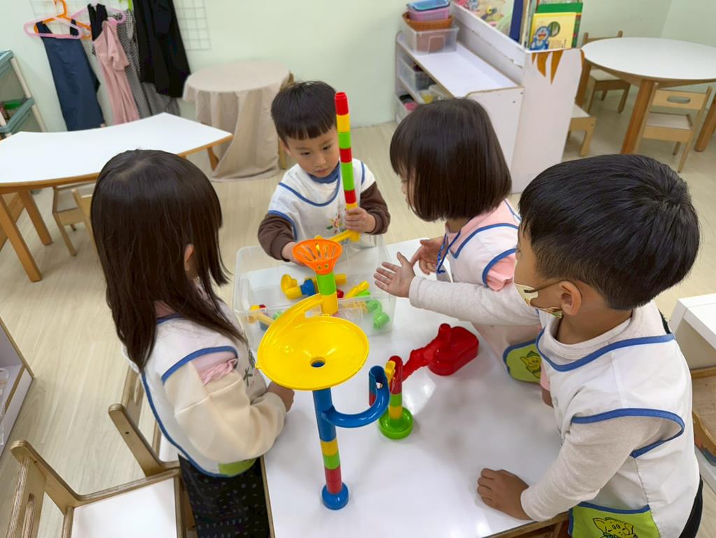 相簿名稱: 數學區-蔬菜拼圖、豆豆夾夾樂;操作六形六色.滾球軌道