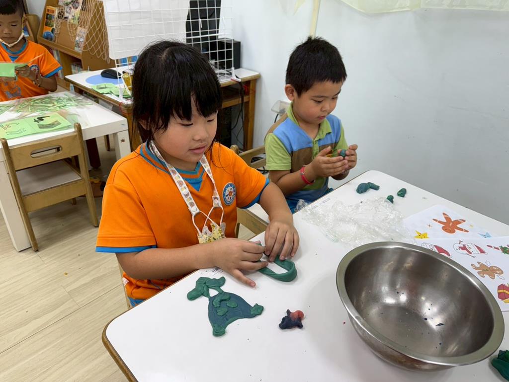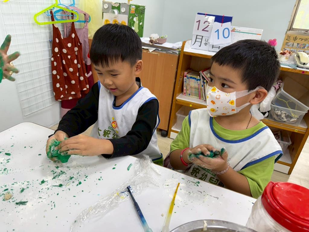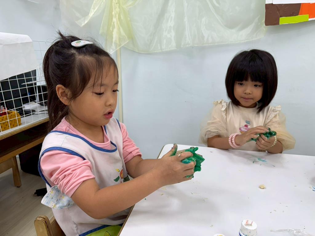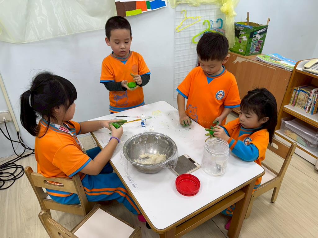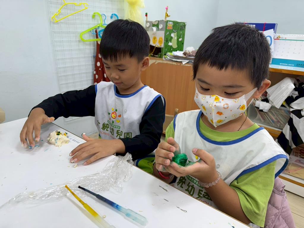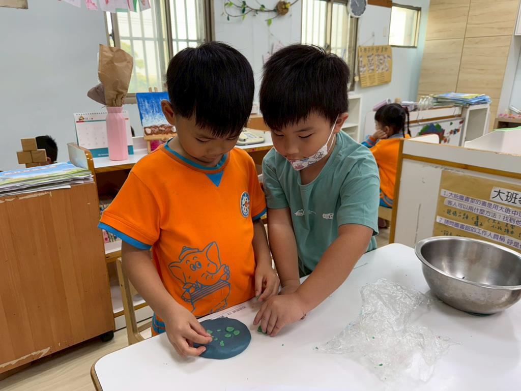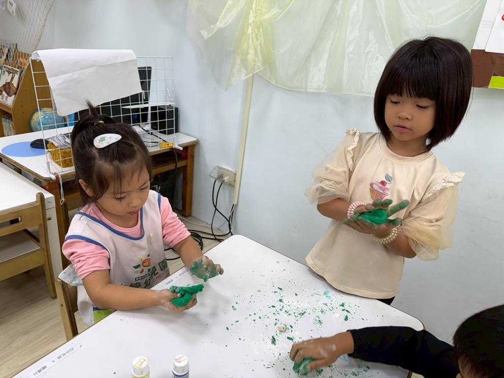 相簿名稱: 娃娃-圖書館活動(麵粉糰染出不同的綠)製作借書證及張貼海報