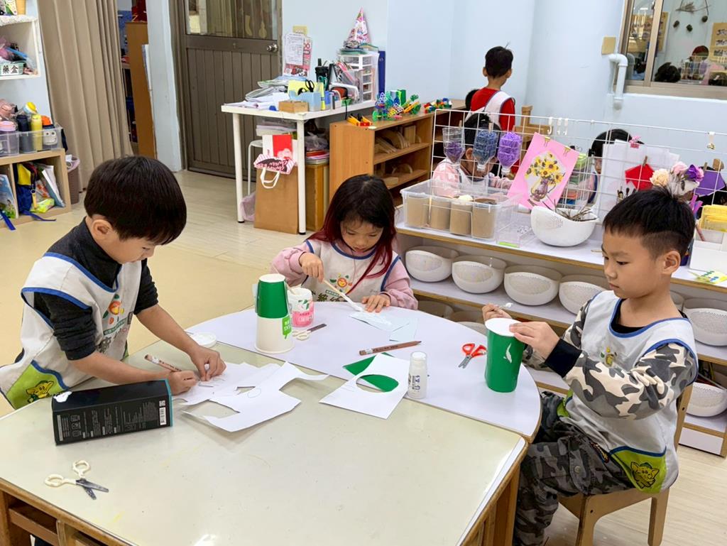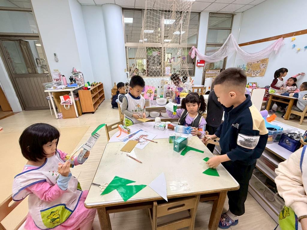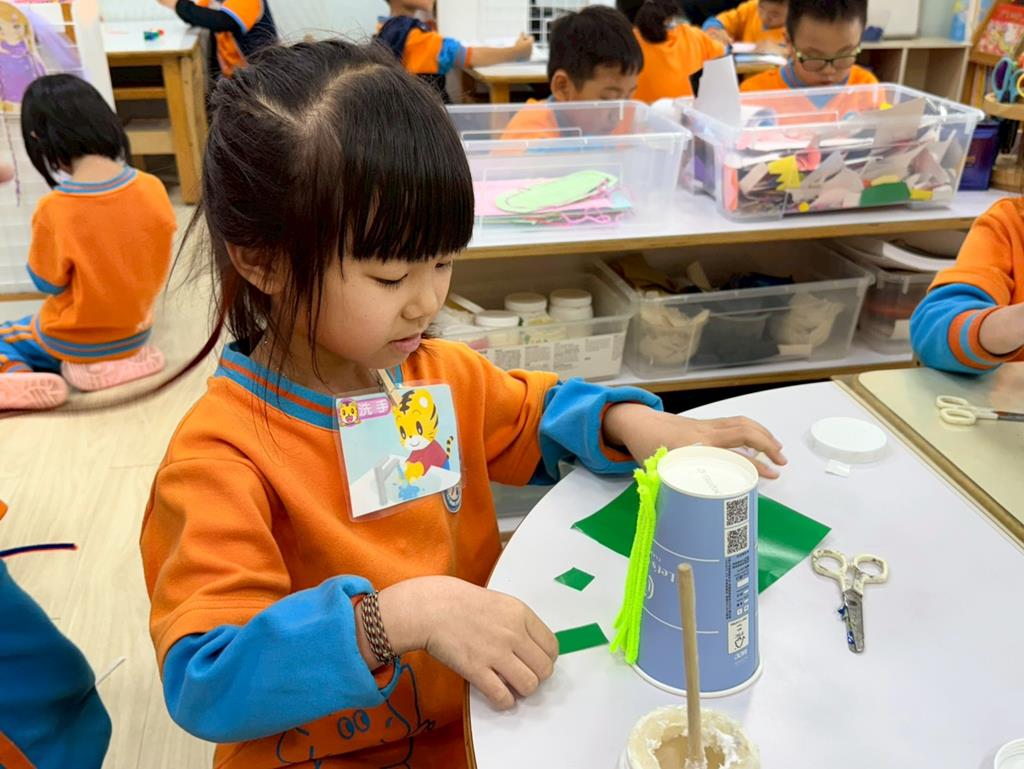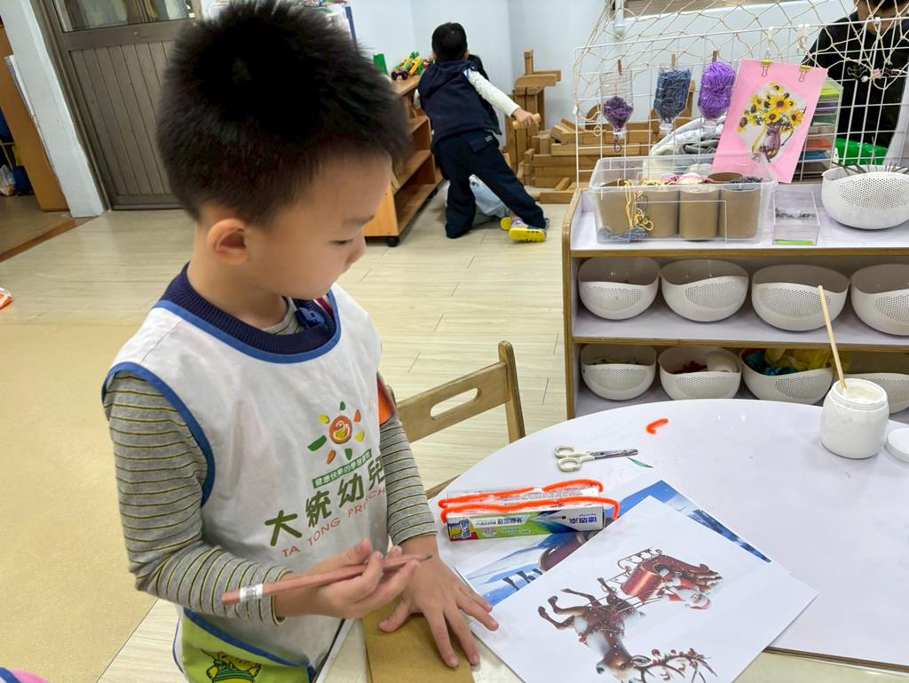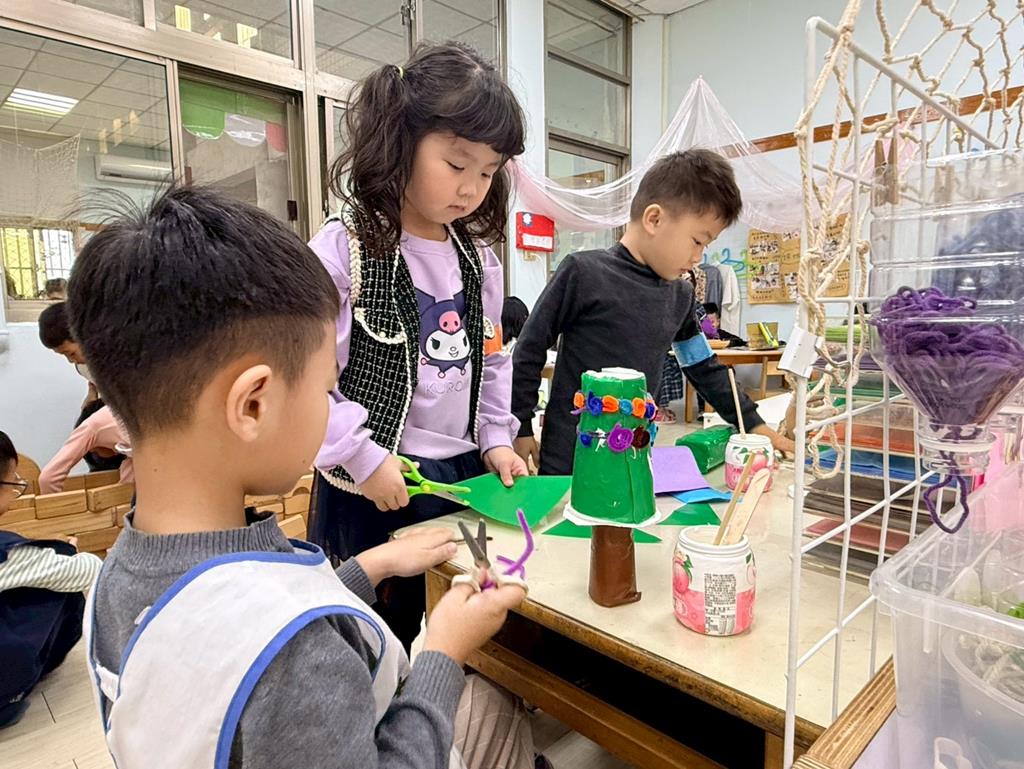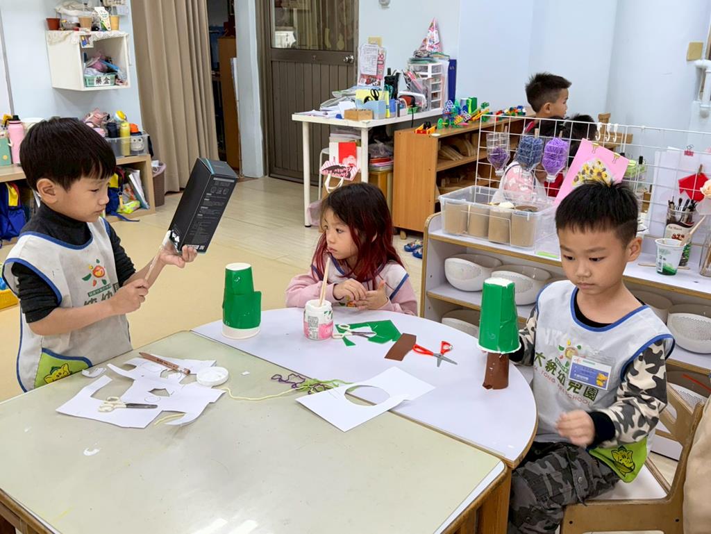 相簿名稱: 美勞區-用毛線編織辮子&製作提袋、聖誕節的雪人和聖誕樹&用各種不同樹葉剪貼佈置花桌