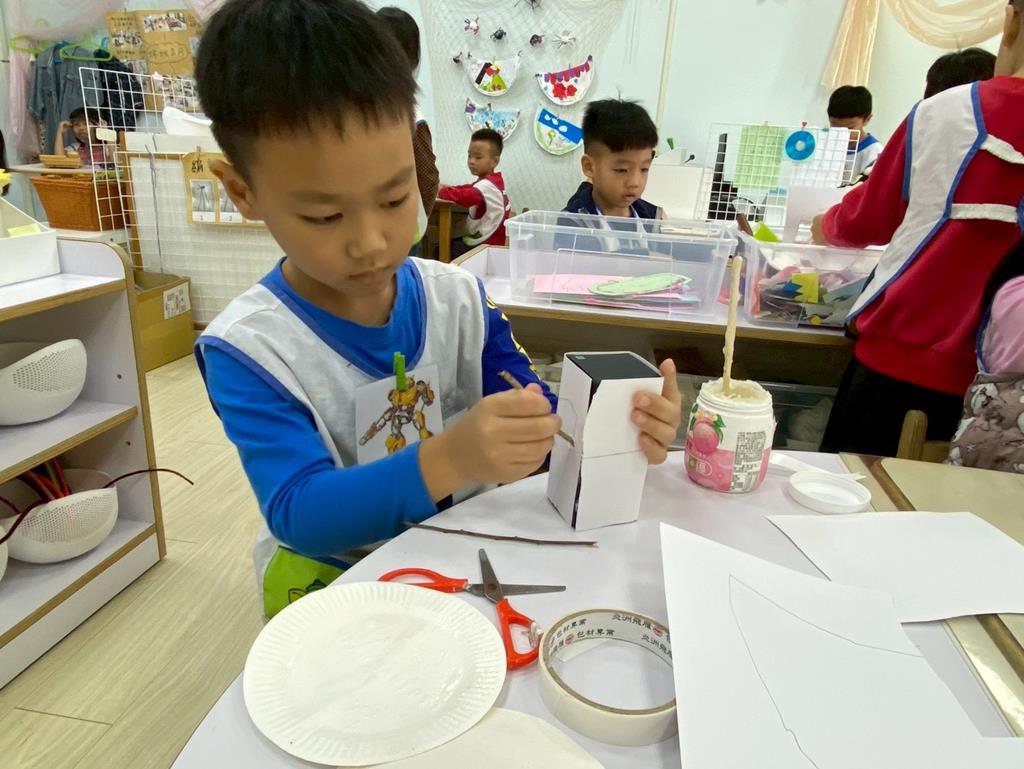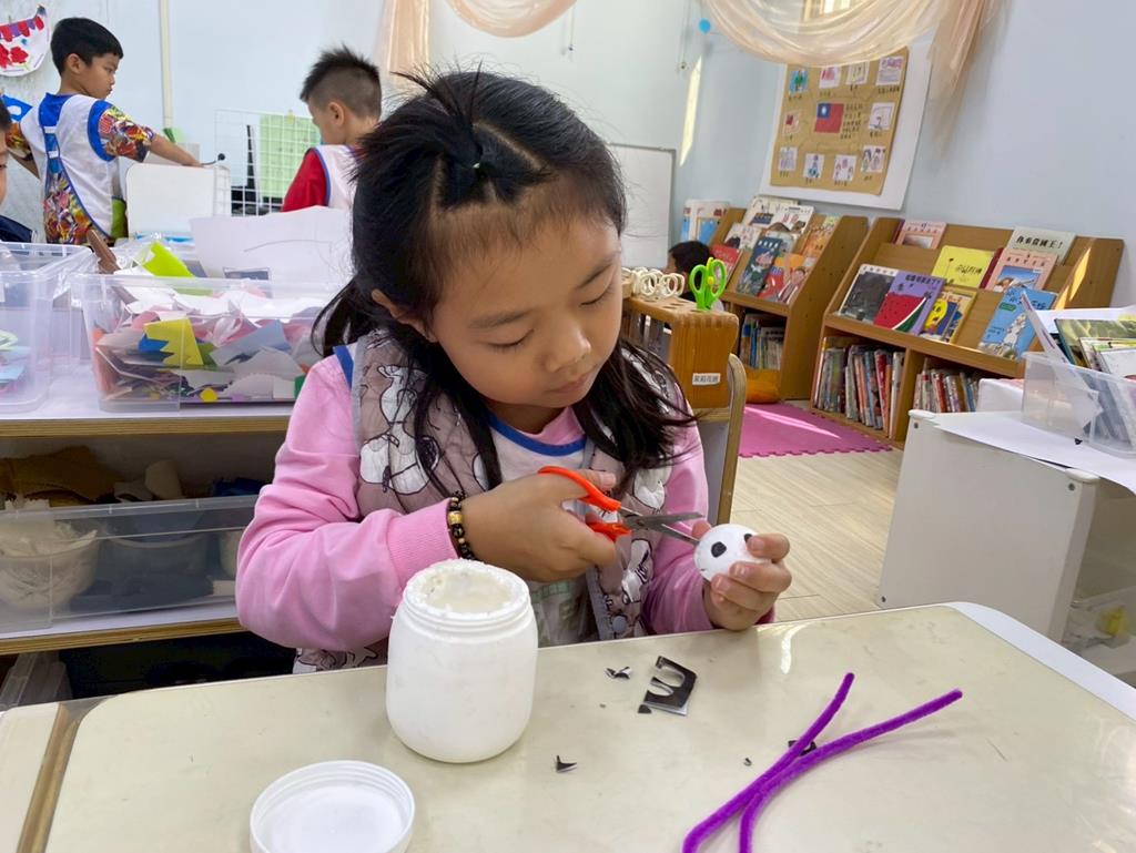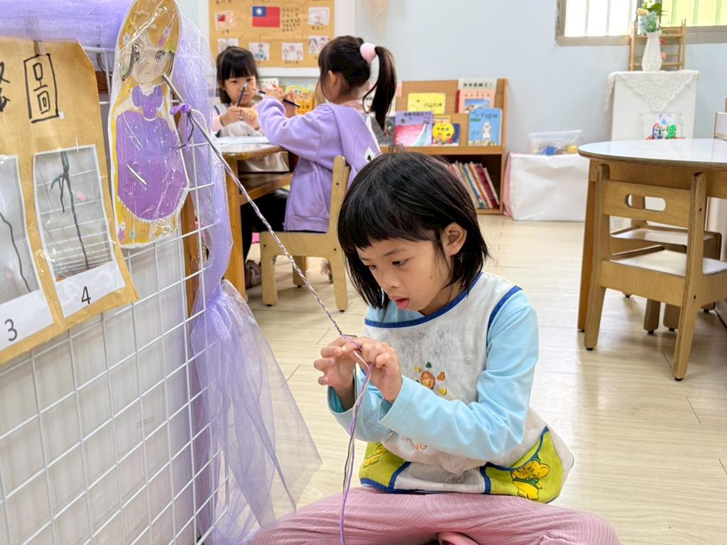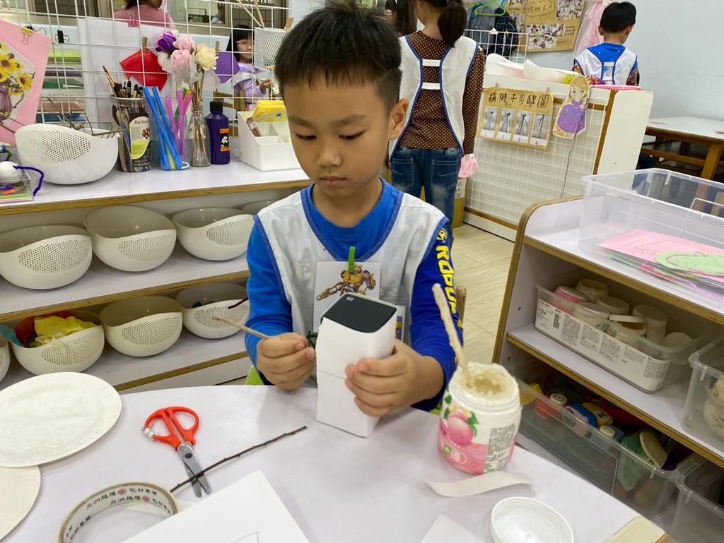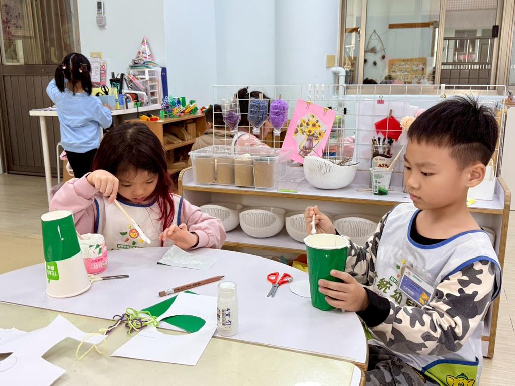 相簿名稱: 美勞區-用毛線編織辮子&製作提袋、聖誕節的雪人和聖誕樹&用各種不同樹葉剪貼佈置花桌