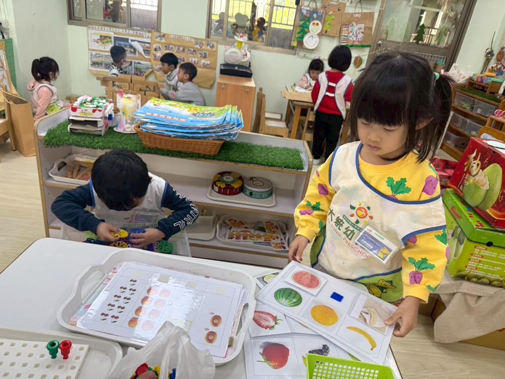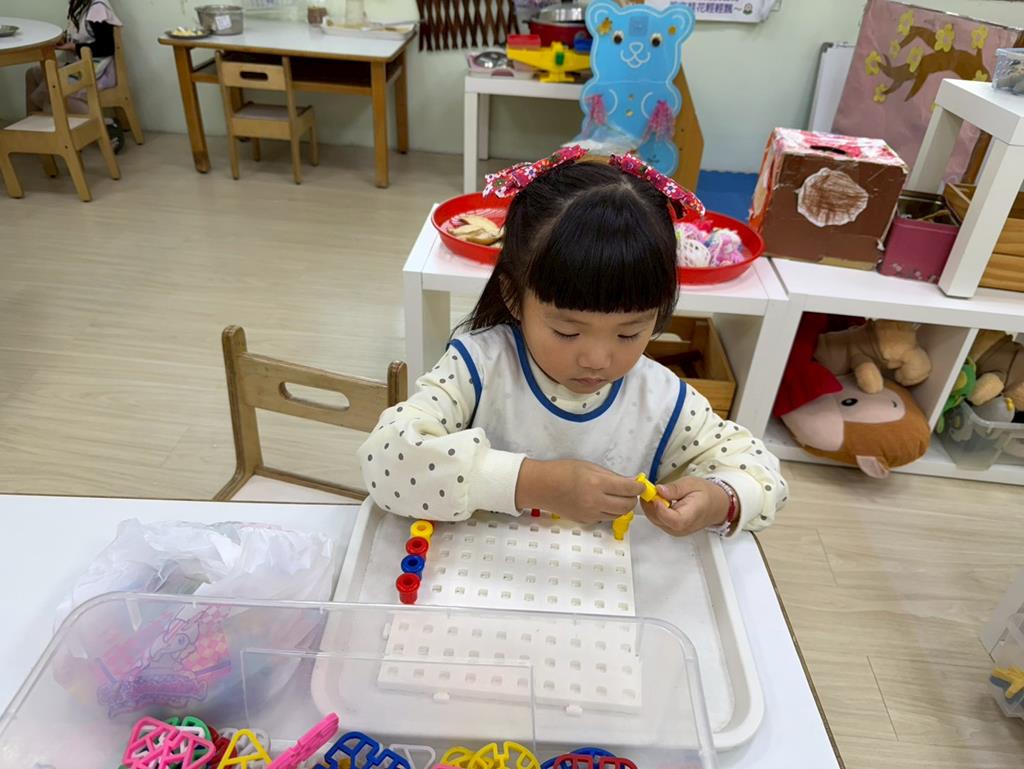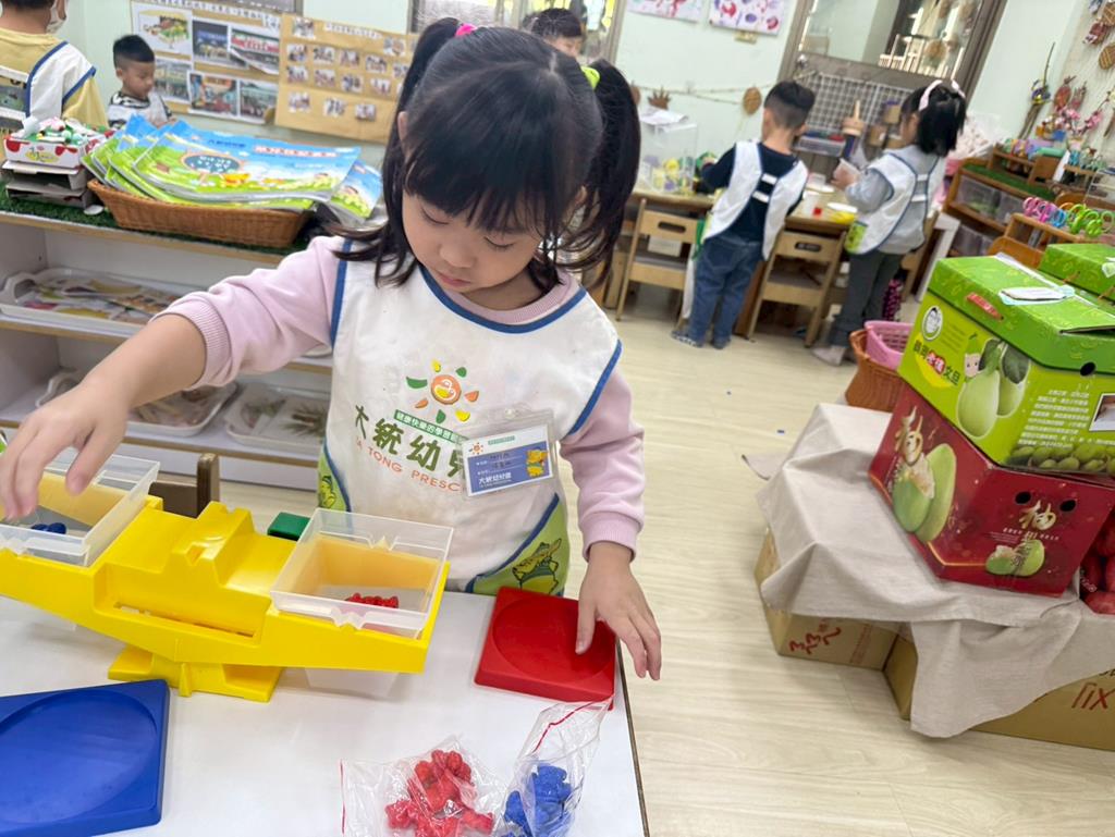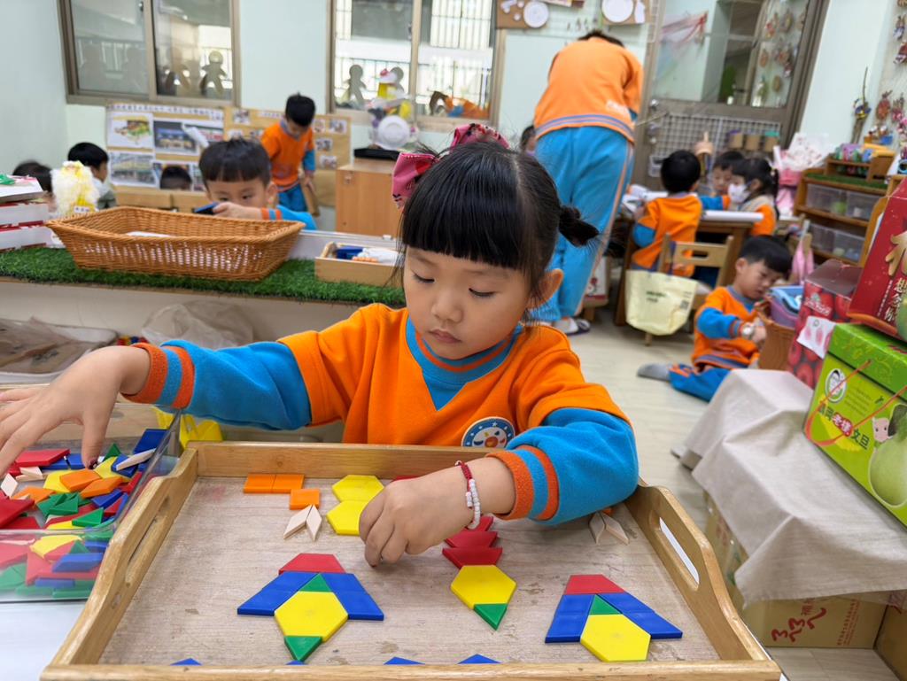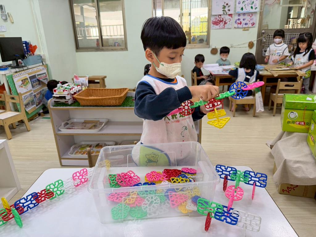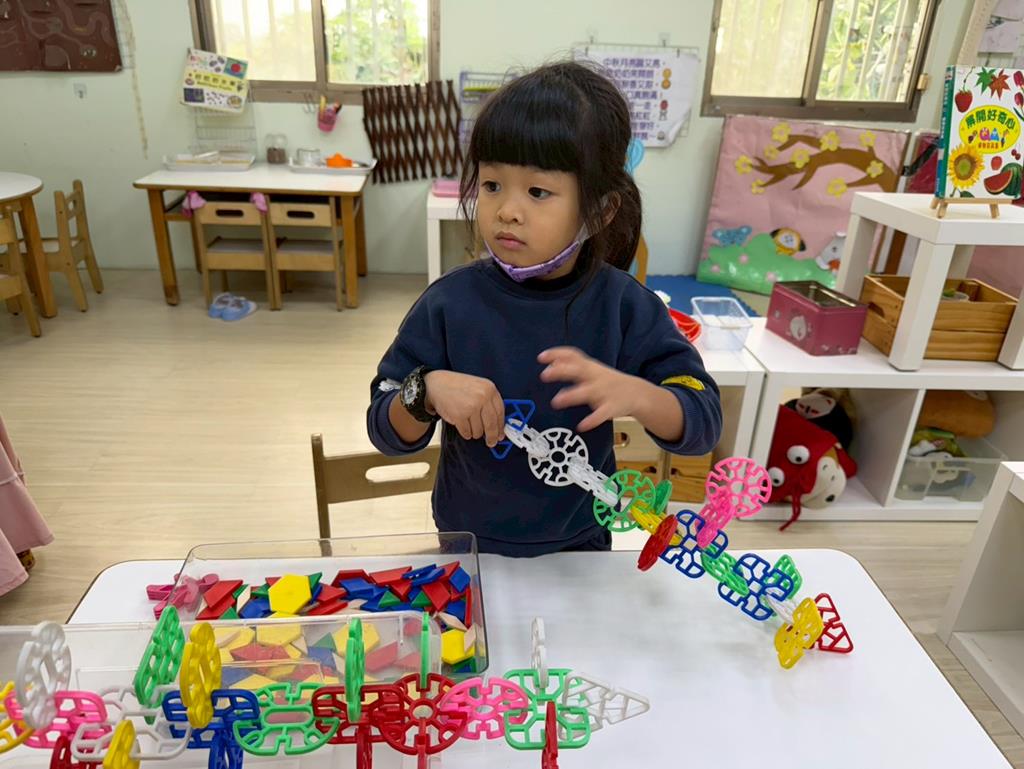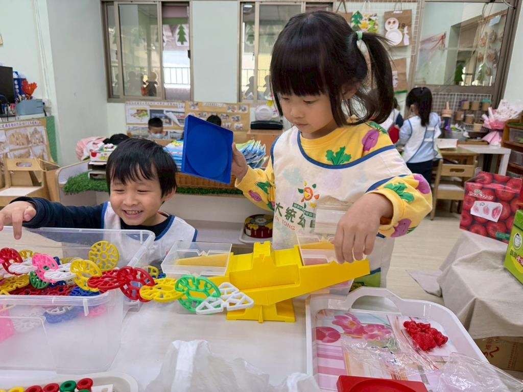 相簿名稱: 組合建構區-組合教具拼飛機及機器人;數學區-平衡小熊、水果剖面圖配對