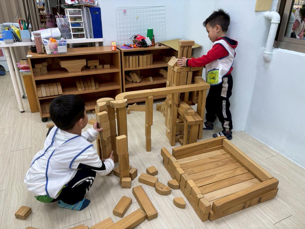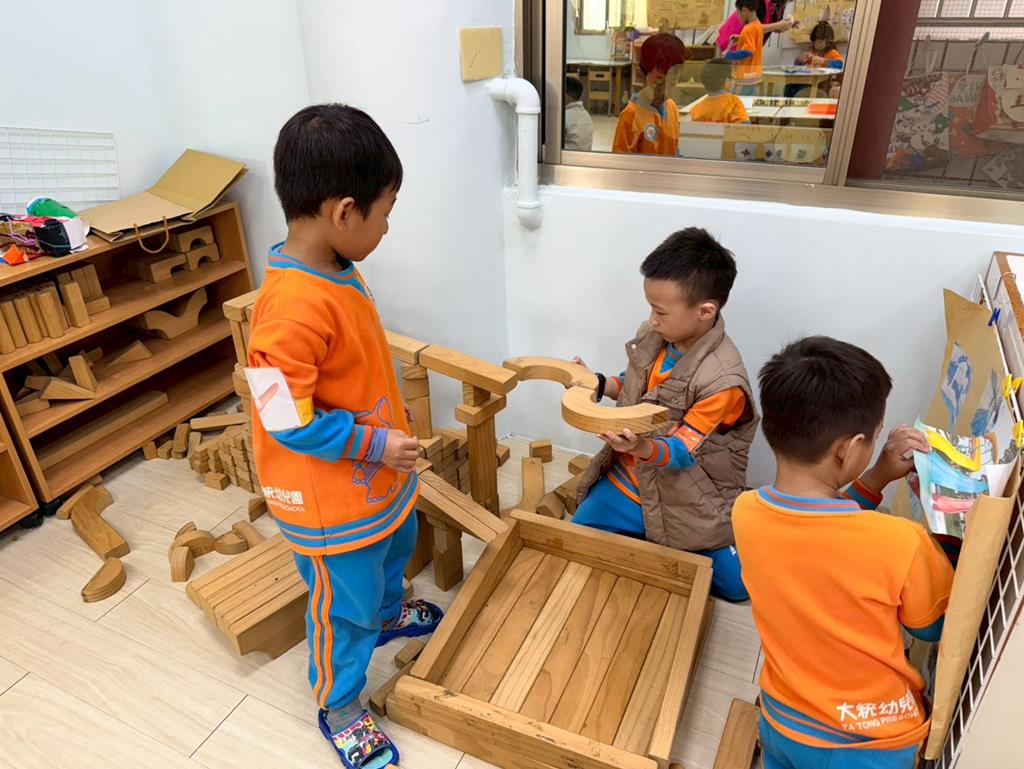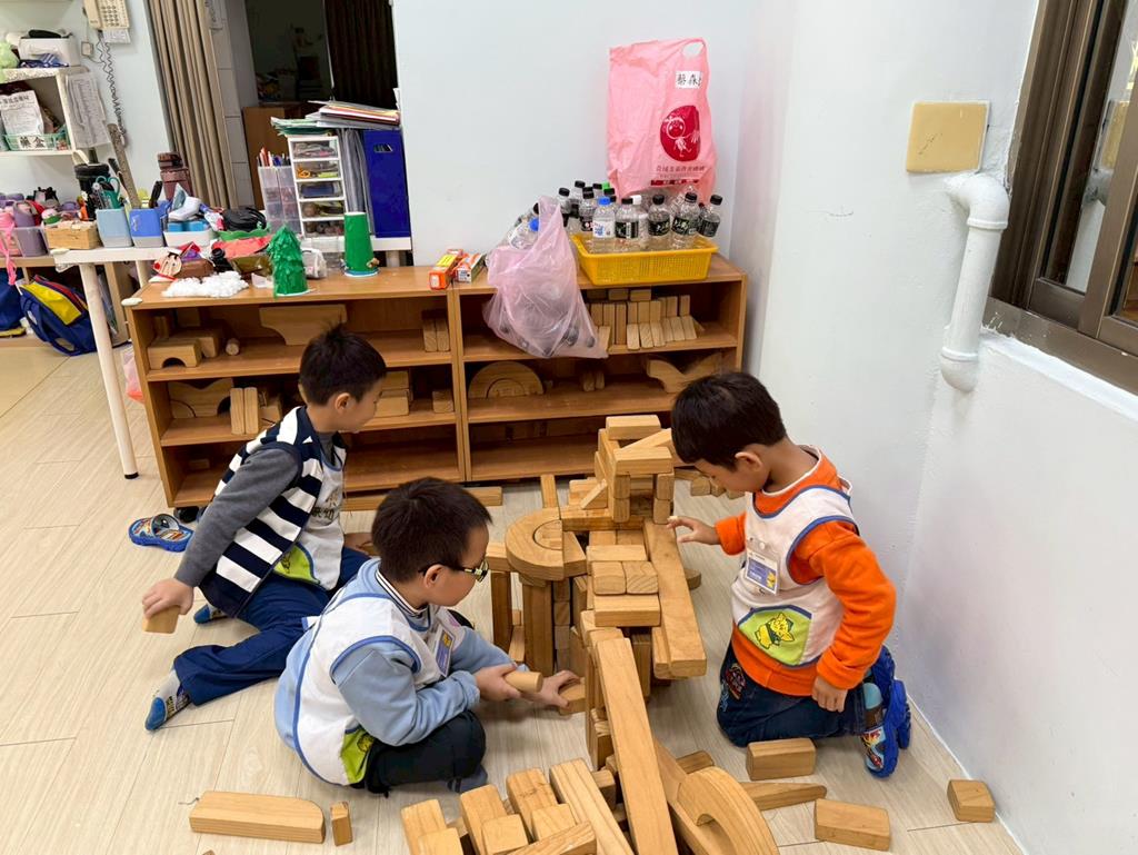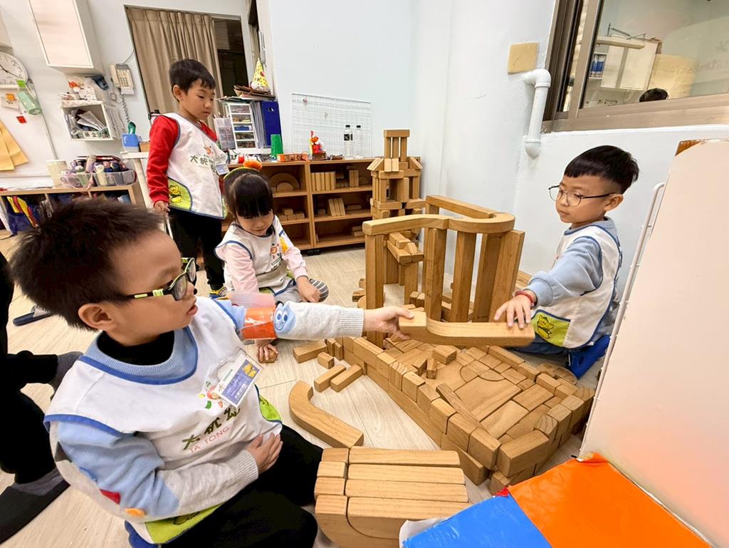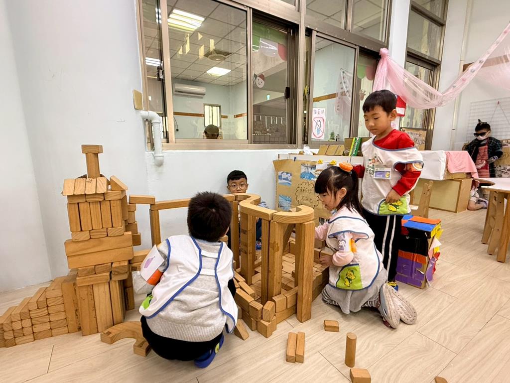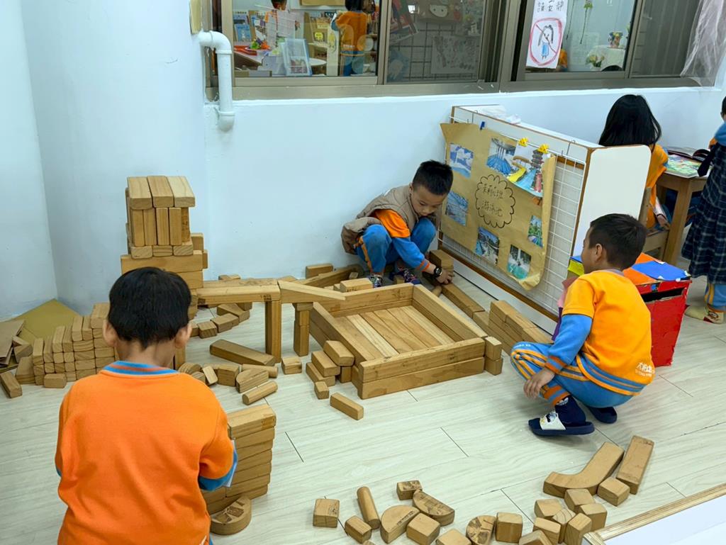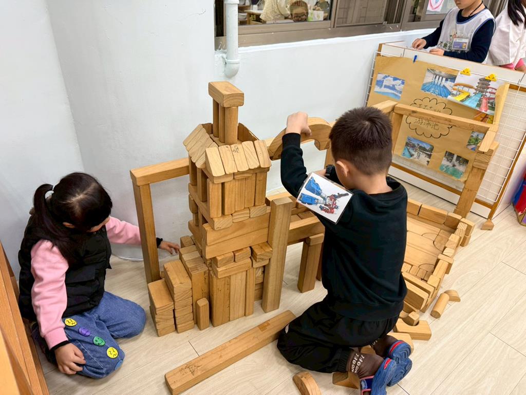 相簿名稱: 積木區-持續搭蓋水上溜滑梯並共同討論滑梯的起點與終點