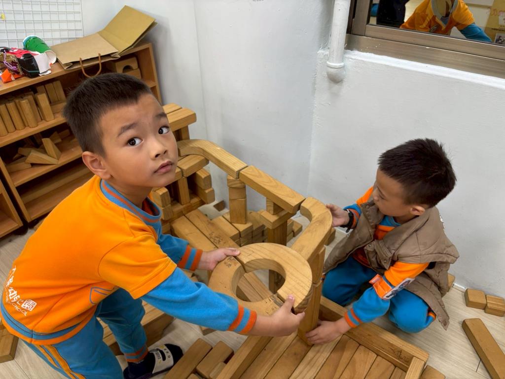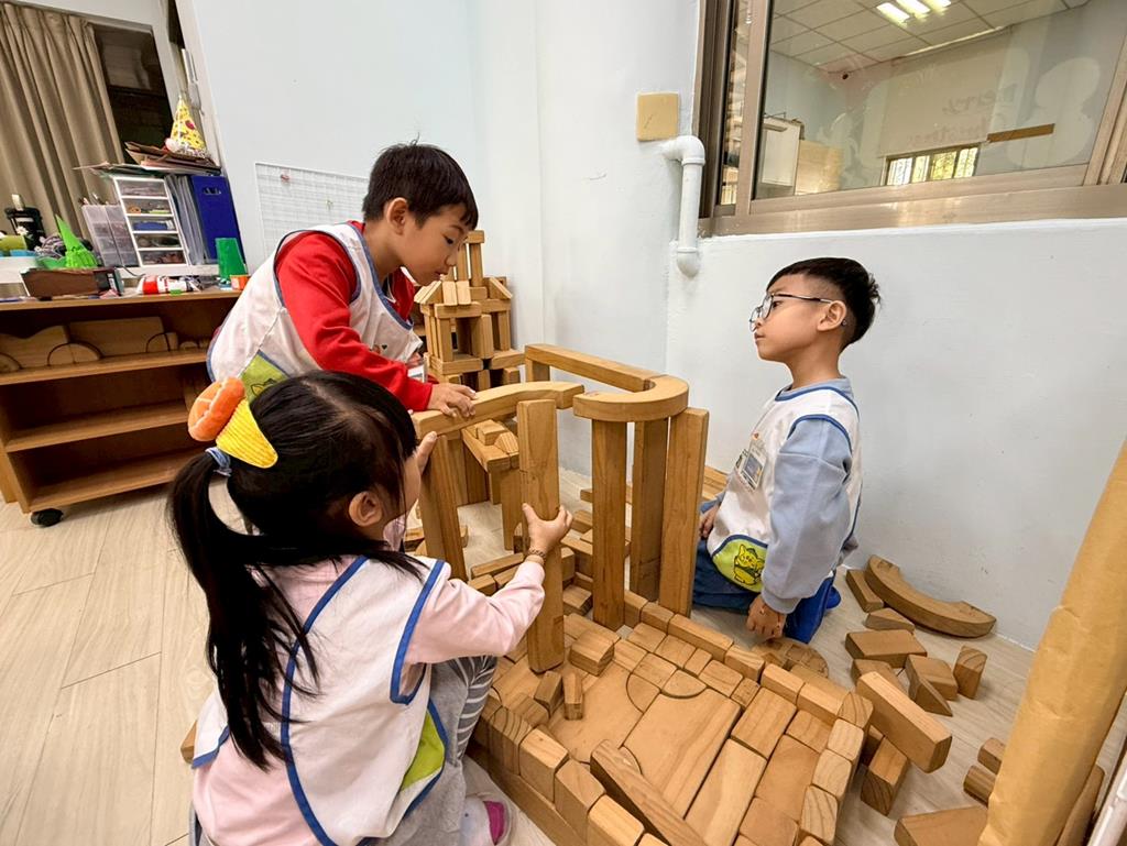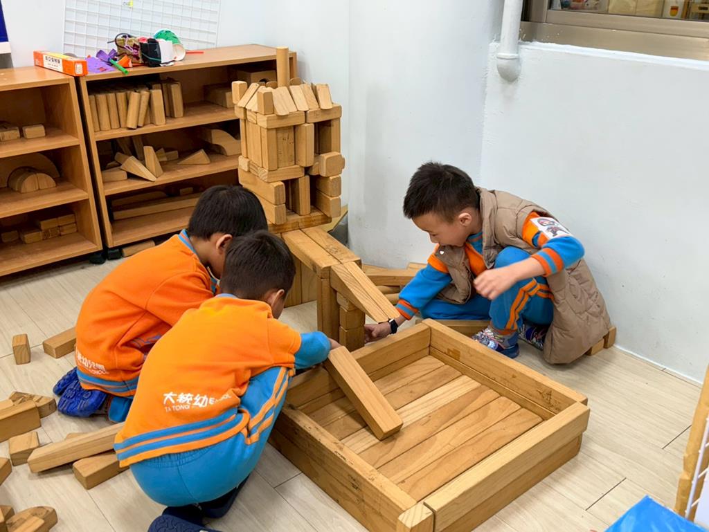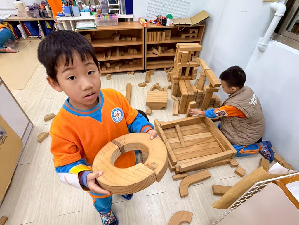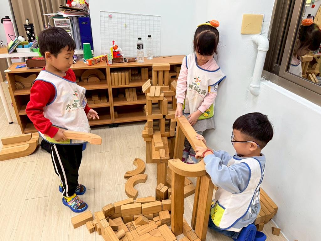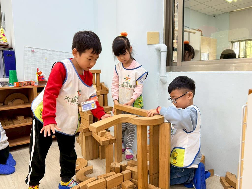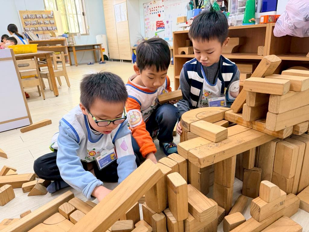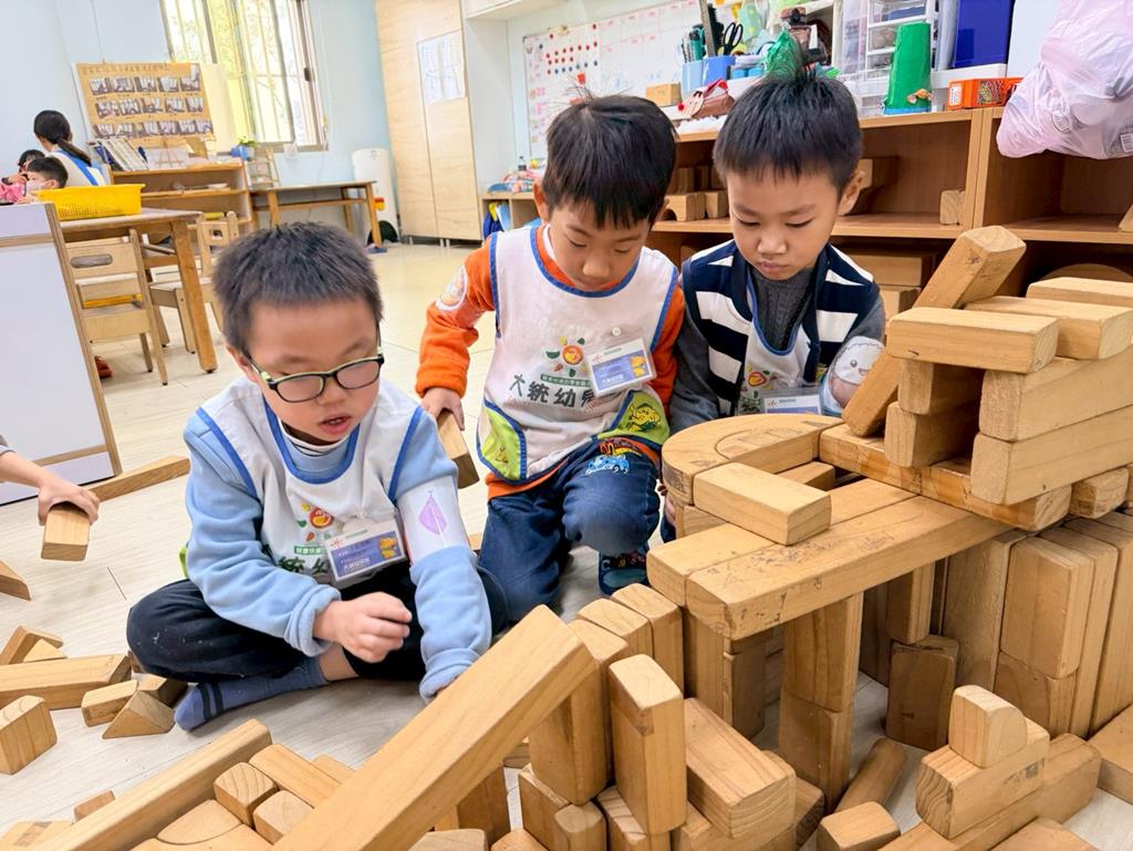 相簿名稱: 積木區-持續搭蓋水上溜滑梯並共同討論滑梯的起點與終點