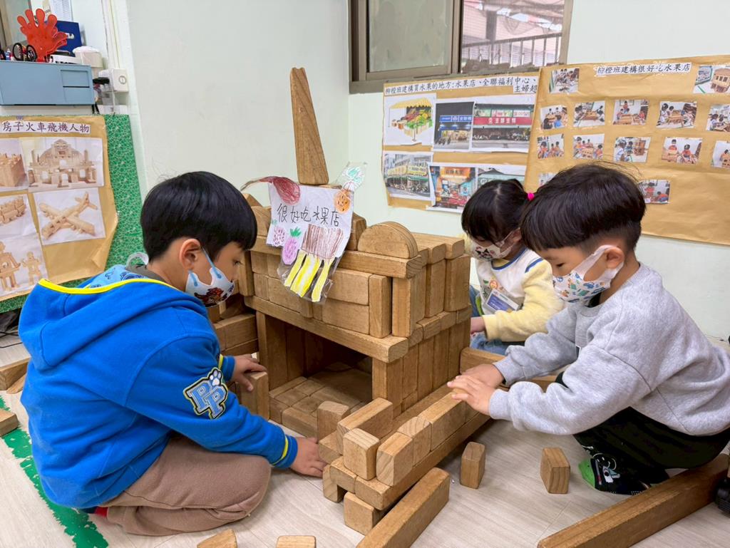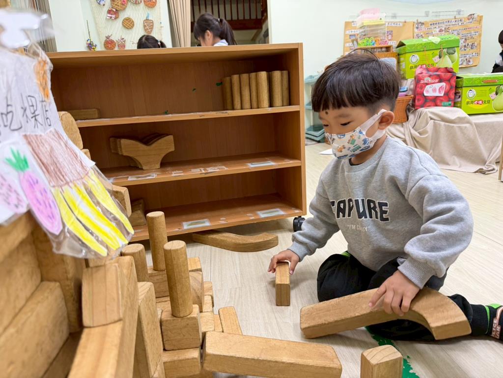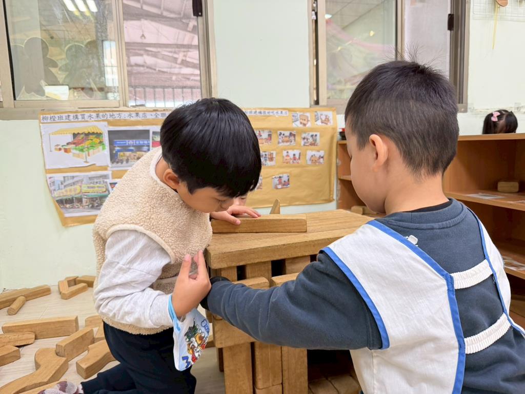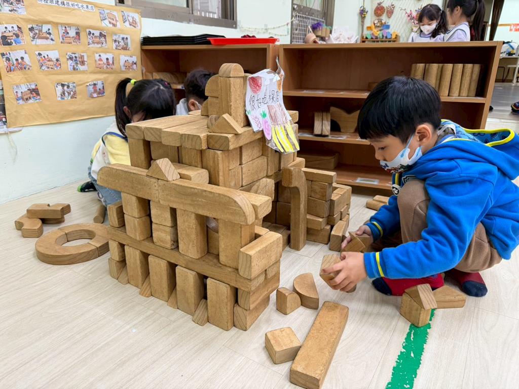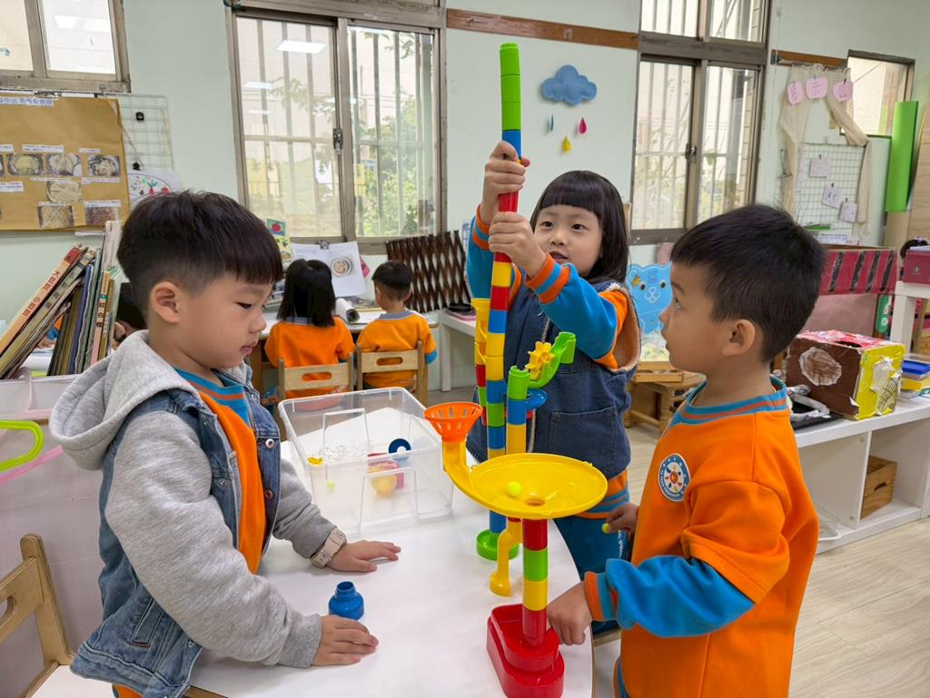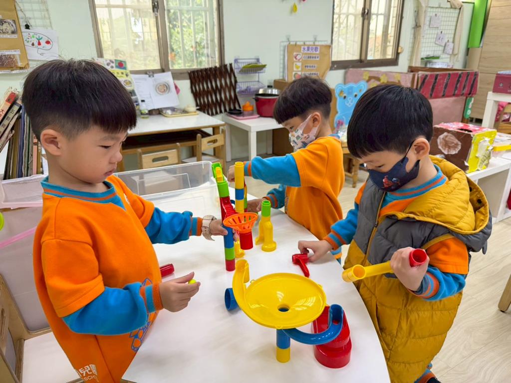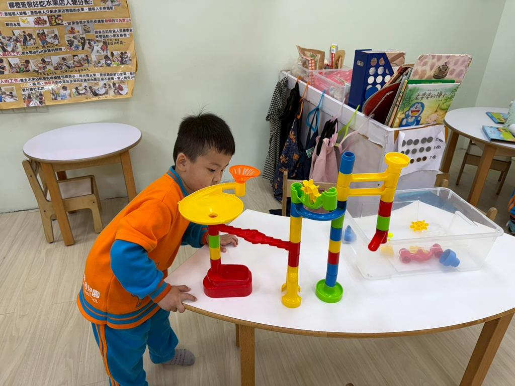 相簿名稱: 組合建構區-運用水管製作彈珠軌道;積木區-建構水果店與鄰居