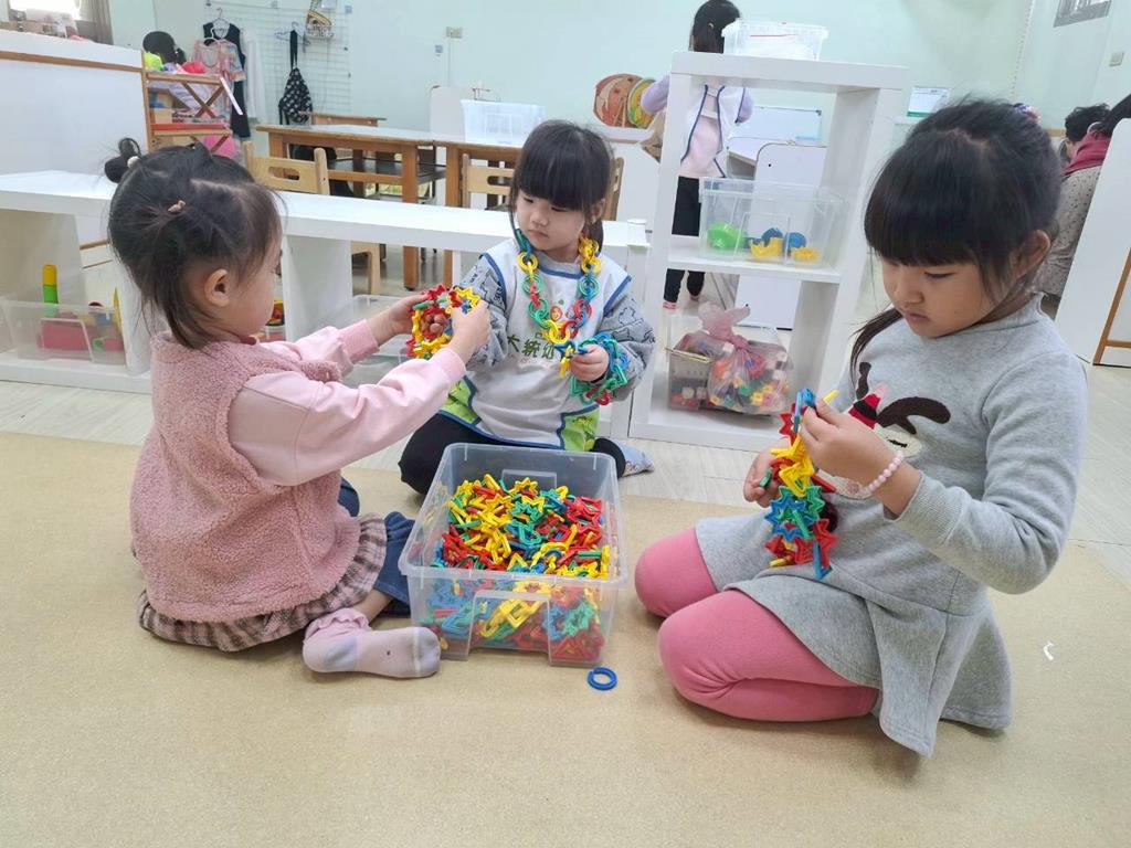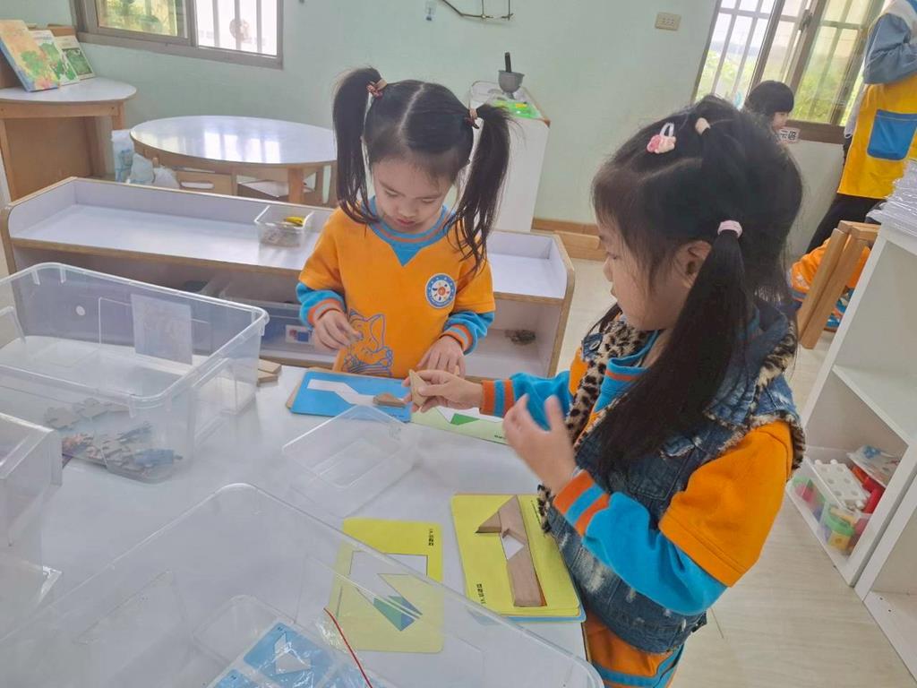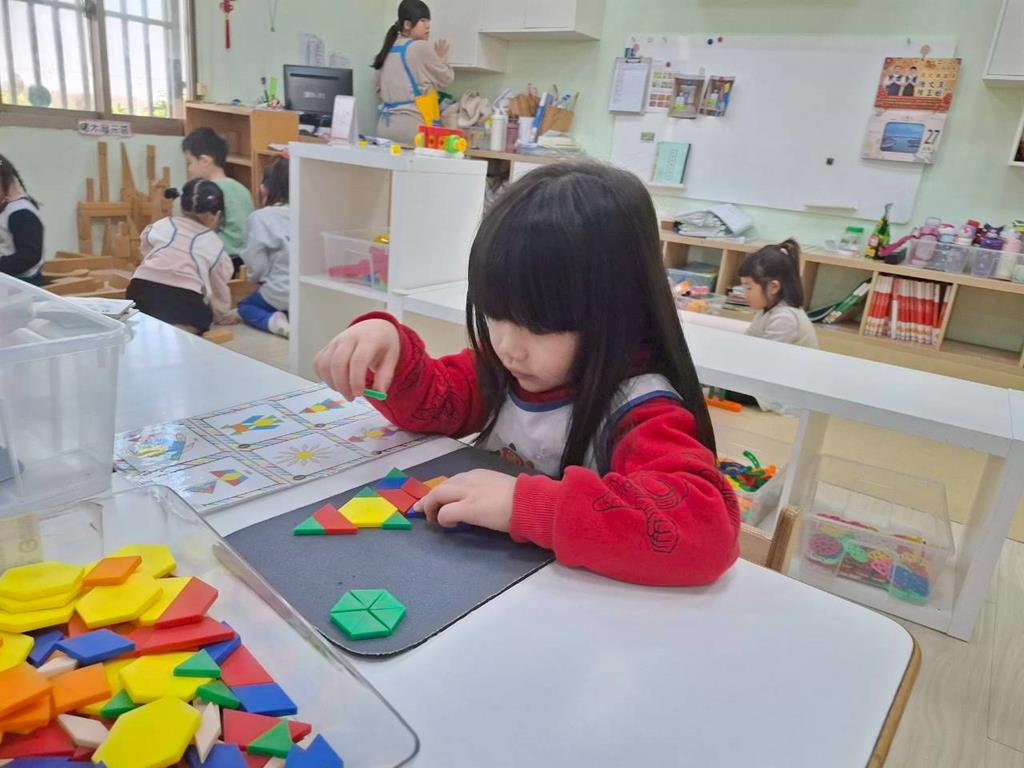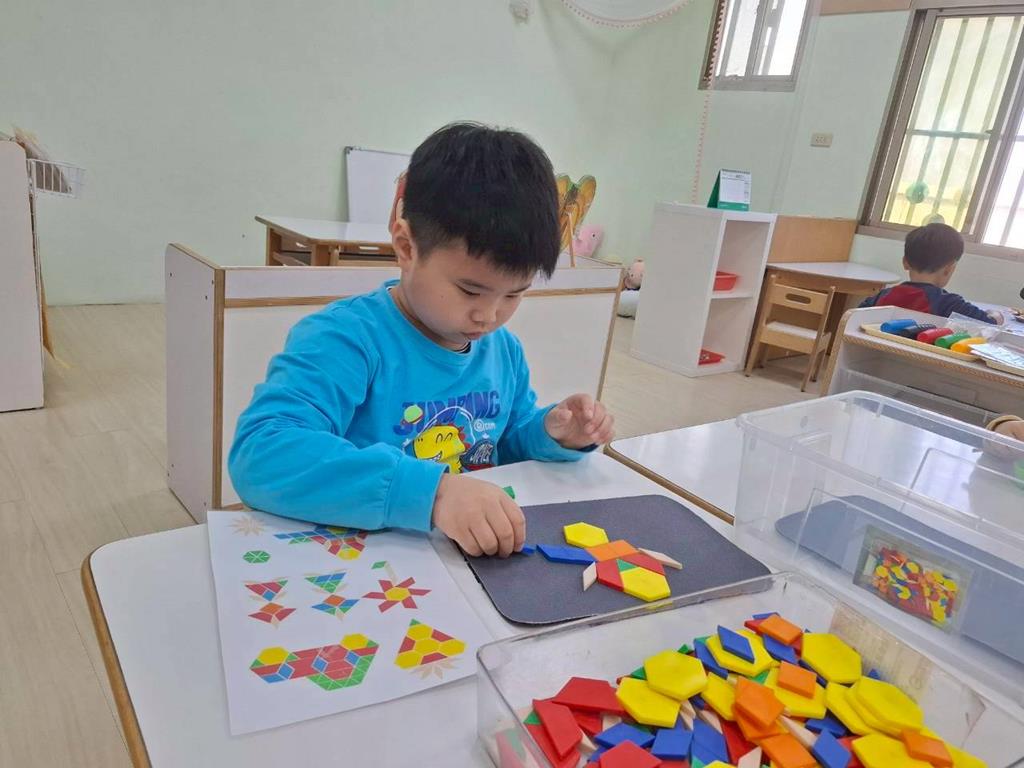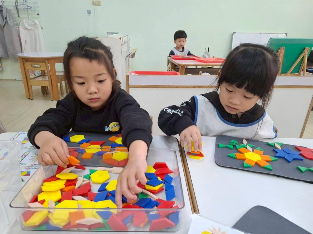 相簿名稱: 組合建構-小小工程師組.幾何鍊條扣環積木;數學區-六形六色.七巧板