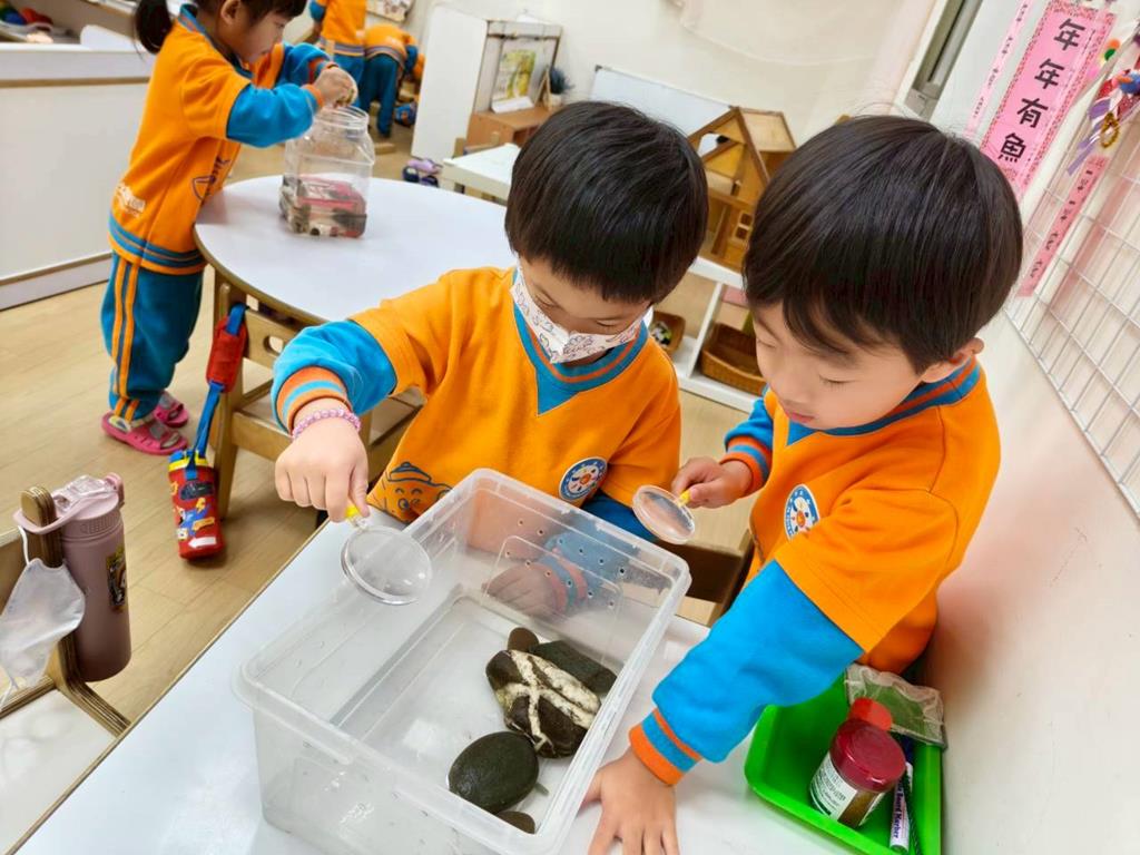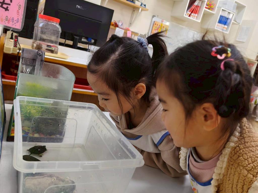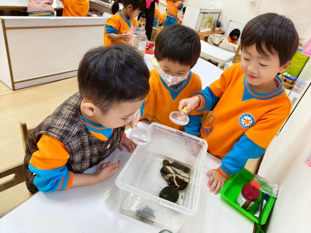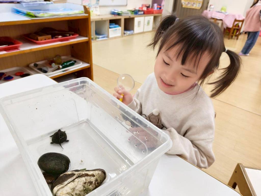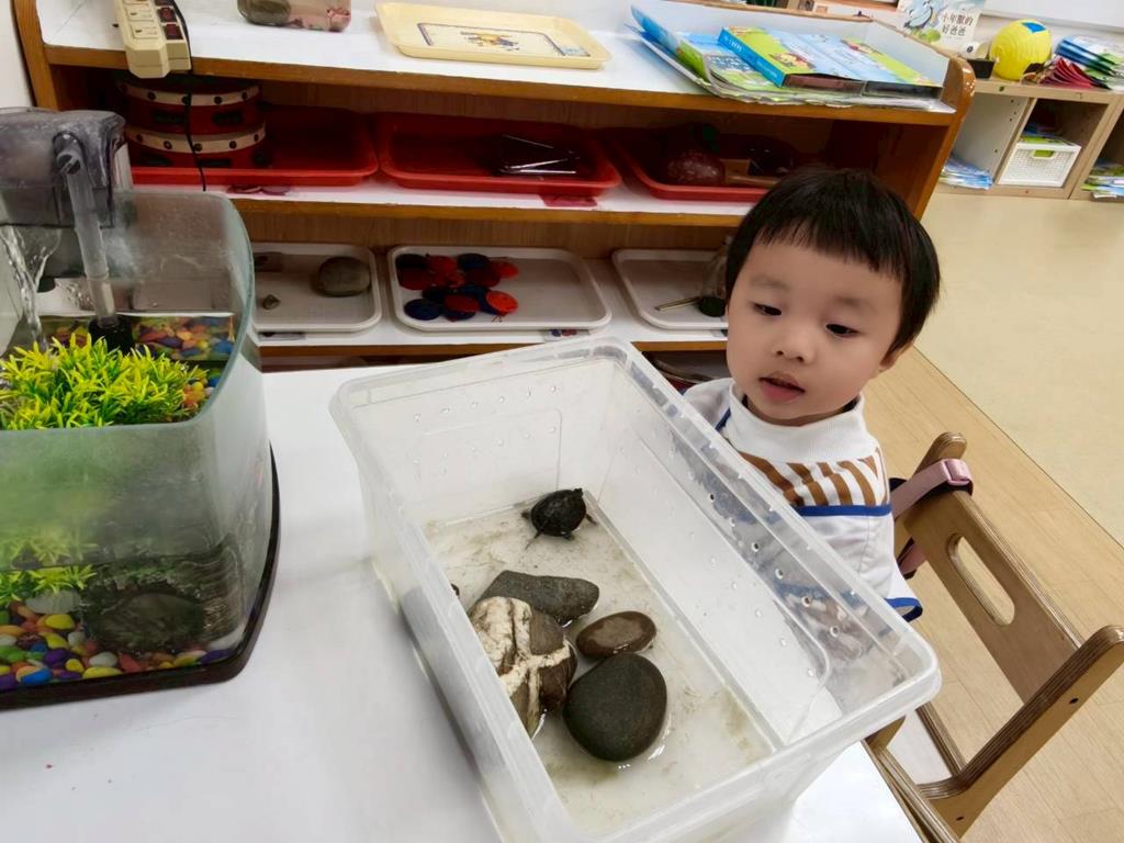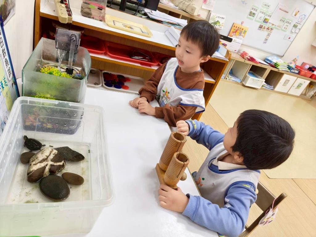 相簿名稱: 科學區-照顧小動物、清洗烏龜的家、放大鏡發現有光線、敲聲音、閉上眼聽聽看有什麼聲音