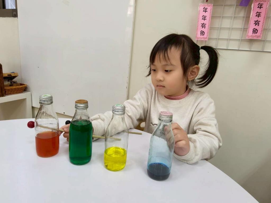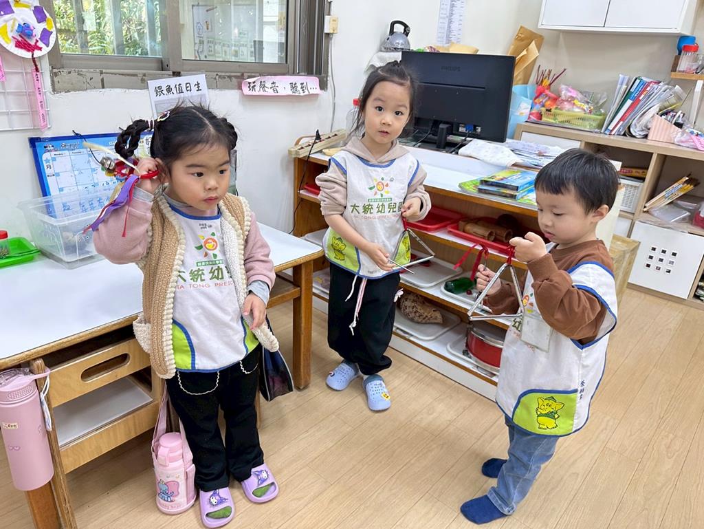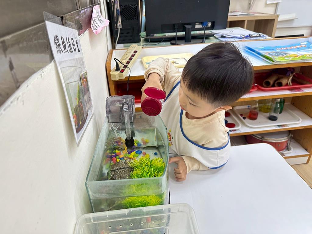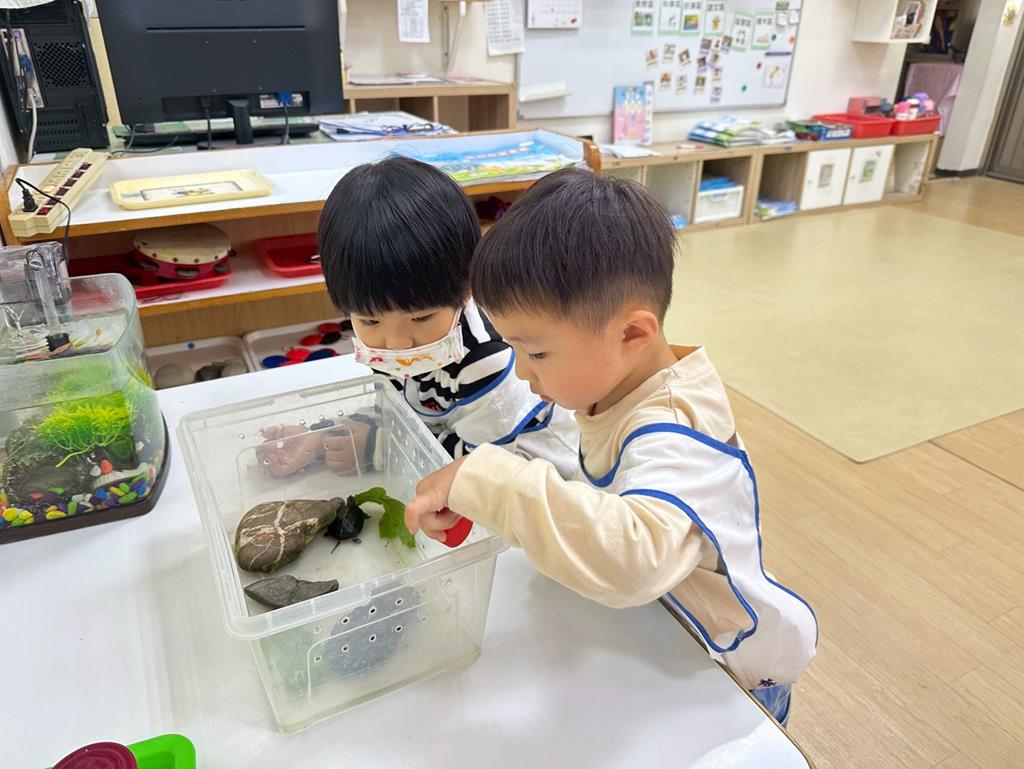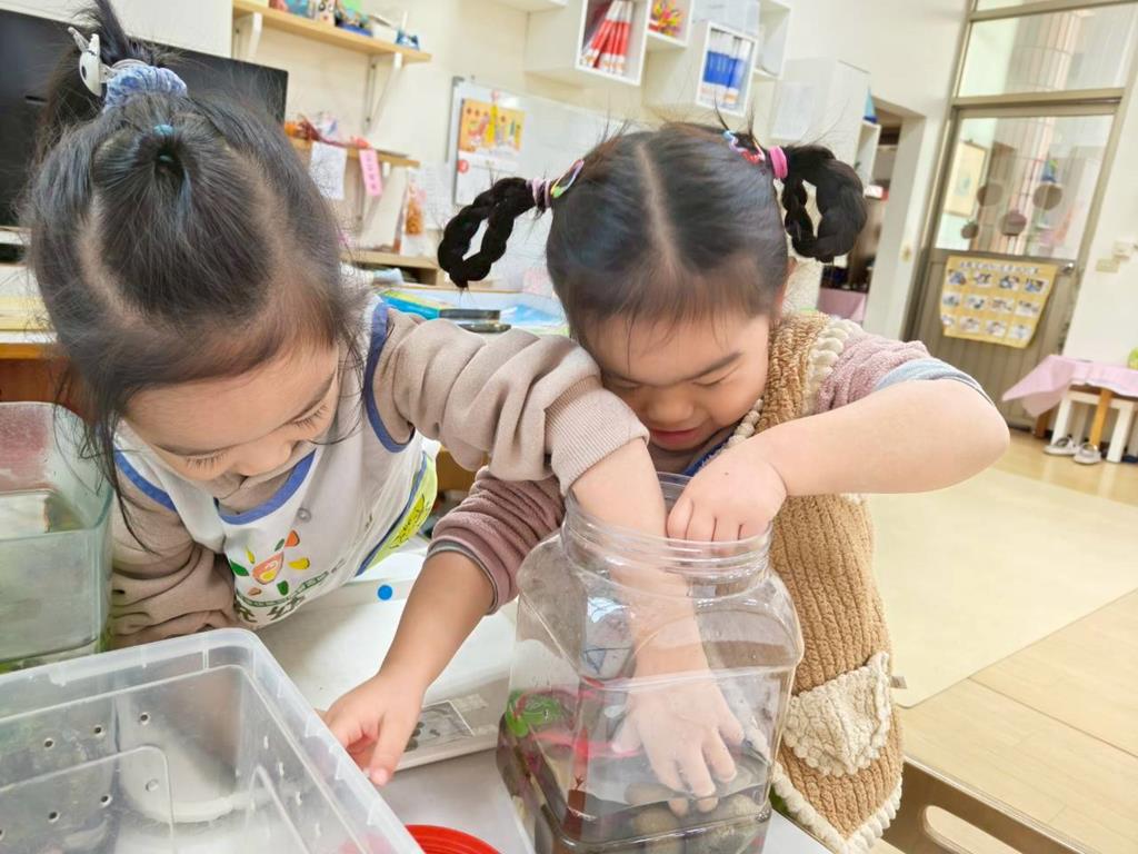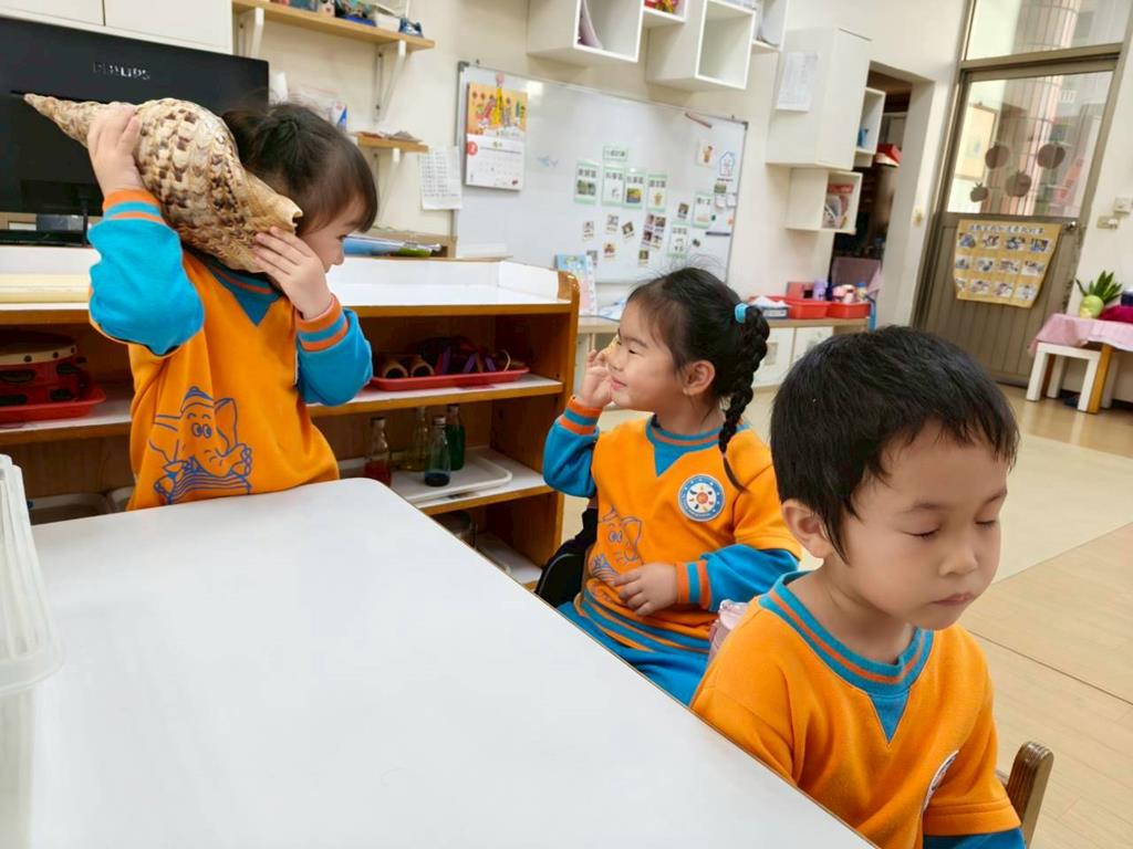 相簿名稱: 科學區-照顧小動物、清洗烏龜的家、放大鏡發現有光線、敲聲音、閉上眼聽聽看有什麼聲音