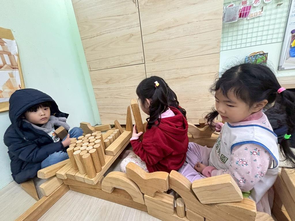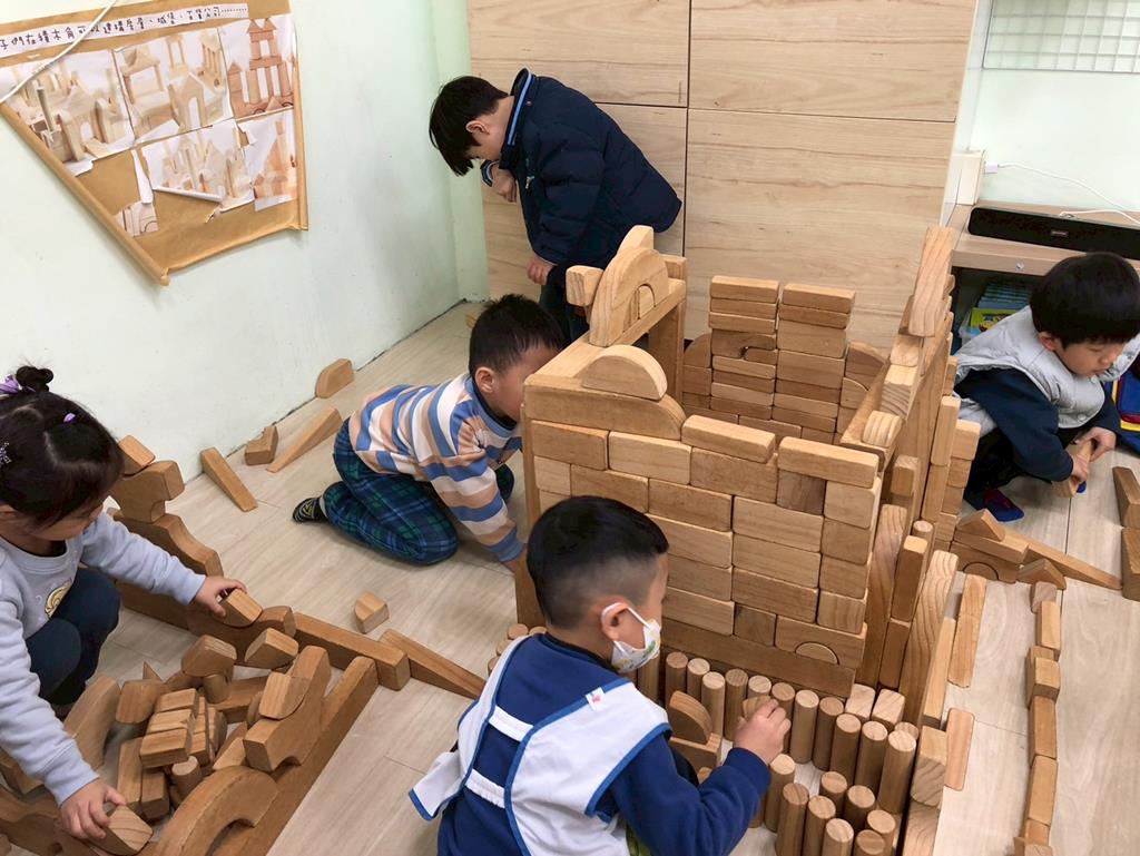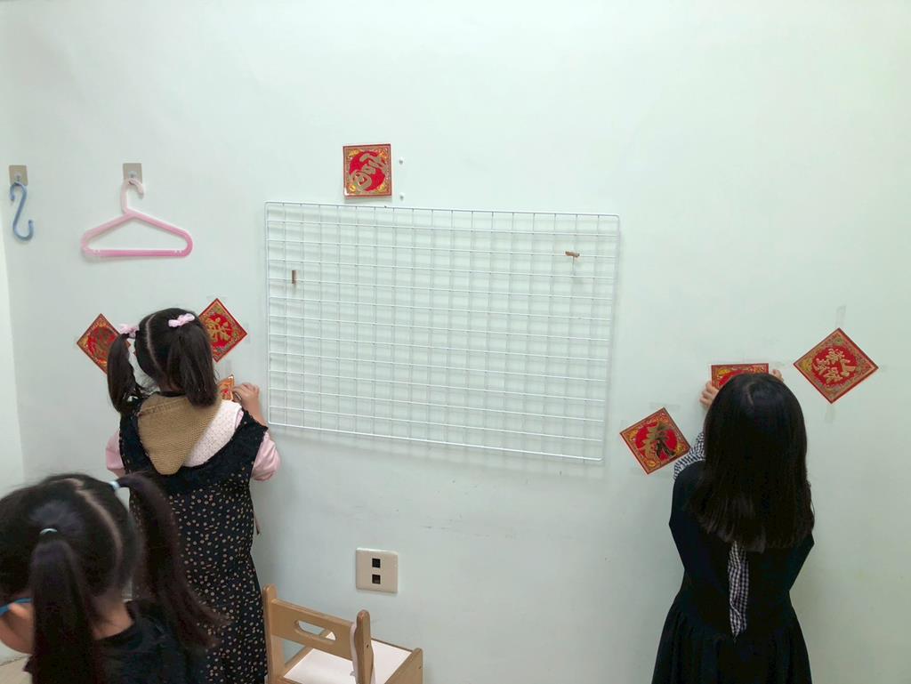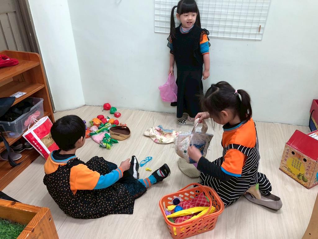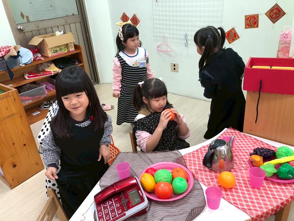 相簿名稱: 扮演區邀請客人來家裡吃水果過年、佈置貼春聯;積木區建構過年相關廟宇